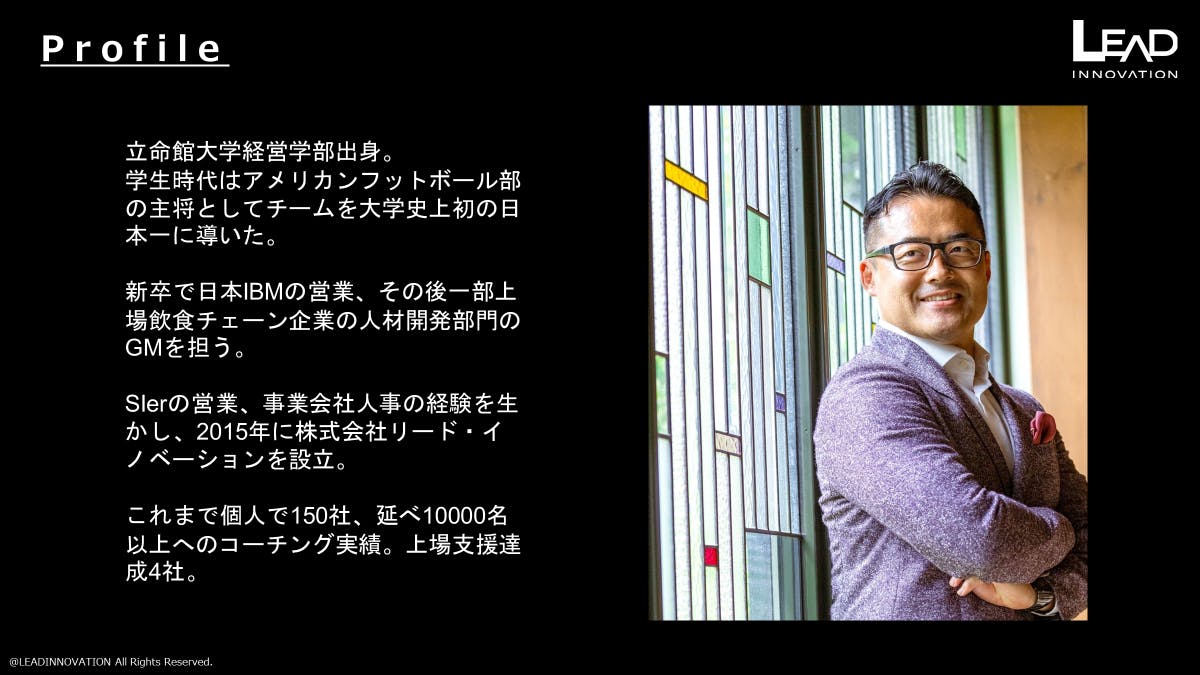 私は、小・中・高・大学・社会人とすべてのチームでキャプテンを担って参りました。立命館大学時代には、アメリカンフットボール部の主将としてチームを大学史上初の日本一に導くことができました。新卒で日本IBMの営業、その後一部上場飲食チェーン企業の人材開発部門のGMを担い、それまでのSIerの営業や事業会社人事の経験を生かし、2015年に株式会社リード・イノベーションを設立。これまで個人で150社、延べ10000名以上へのコーチング実績と上場支援達成4社。サービスコンセプトはBLASTER(突風を巻き起こす人)。自社での営業/採用/組織開発の経験や、コンサルティング現場での経験を通じてBLASTERを研究、体系化し、クライアント企業が成長するきっかけBLAST(突風)を提供、日々史上最高のチーム創りに奔走しています。まさに、チームづくり・リーダーシップを研究している不器用な男です。