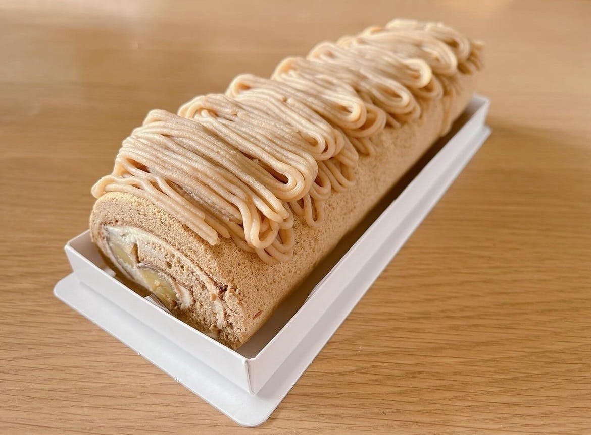 米粉で作ったシフォン生地にマスカルポーネクリームと自家製渋皮煮を巻き、自家製モンブランクリームを絞りました。