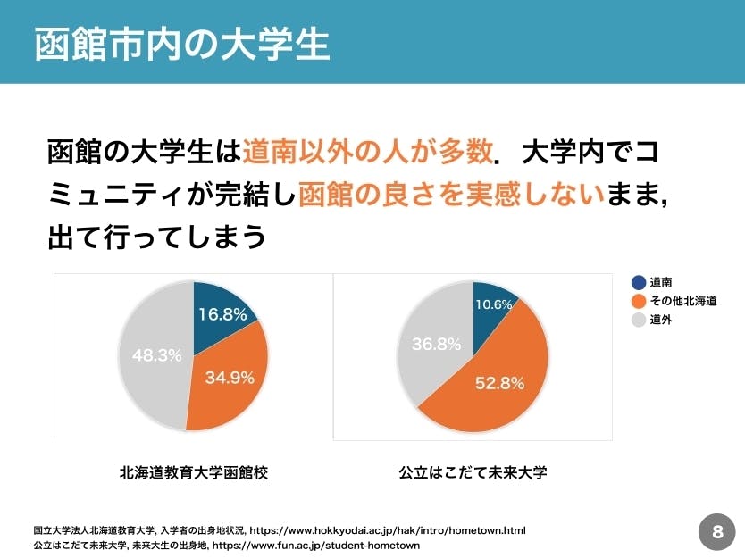 私たちは大門学生祭を開催するに向けて「地元になる場所」というコンセプトを掲げて活動しています。函館には大学4つ、短大が2つ、高専が1つあるのですが、特に大学においては函館出身の学生は非常に少ないのです。下の2つの円グラフに北海道教育大学函館校と公立はこだて未来大学の学生の出身地をまとめました。函館の大学生は道南以外の人が多数であるということがわかります。大学進学をきっかけに函館に引っ越してきて暮らした大学生の多くは就職によって函館から離れてしまいがちです。