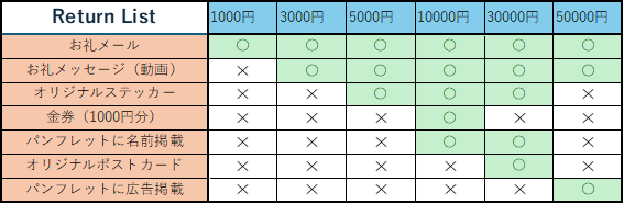 今回私たちが用意したリターンは以下の通りです。