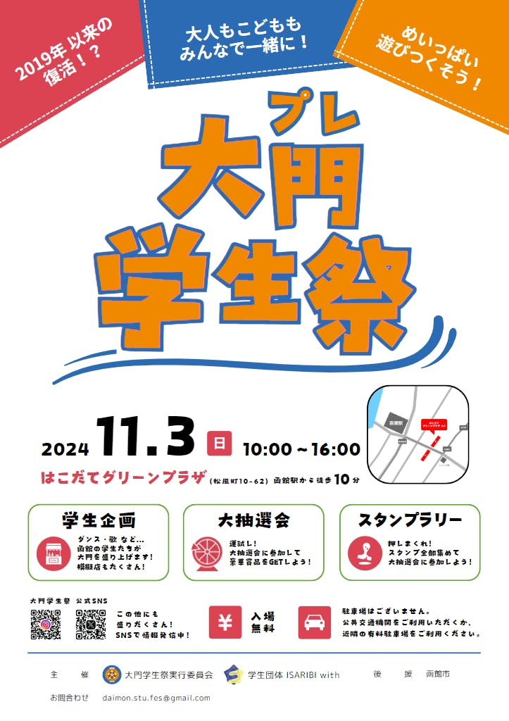 2024年11月3日、地域住民・函館の大学生に大門学生祭の存在を周知するために「プレ大門学生祭」を開催します。そして、2025年7月「大門学生祭」を開催し、このお祭りを完全復活させます。