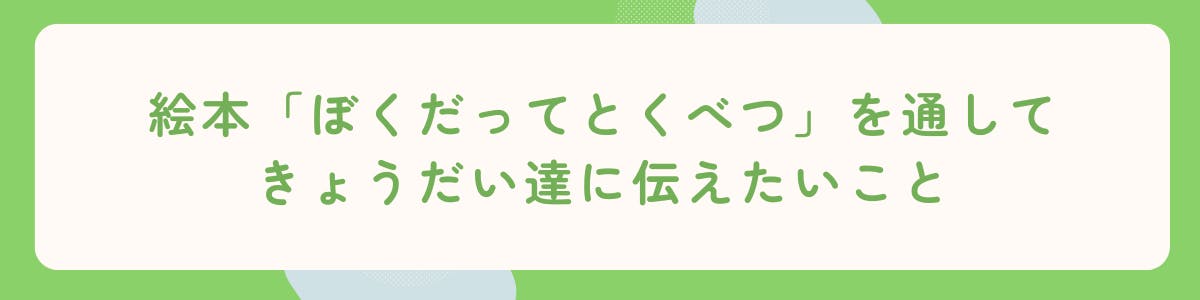 このプロジェクトは、重い病気や障がいを持つ兄弟姉妹である「きょうだい児」にのみスポットをあてた絵本「ぼくだってとくべつ」を、より多くの「きょうだい」達に届けるためのものです。