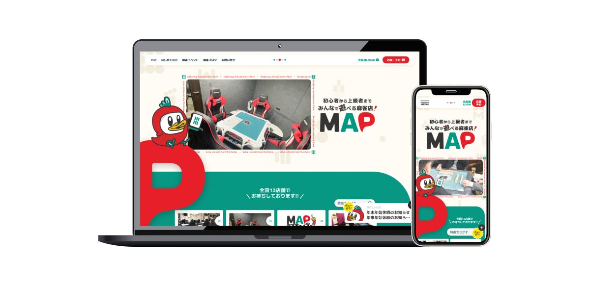 2024/09/15 18:31まぁじゃんMAPの公式サイトをリニューアルしました!https://mj-map.com/旧サイトからのリニューアルとあわせてリブランディングの提案を行い、まずはロゴの制作を2023年12月頃から始めていました。「全国・世界に200個の麻雀店のマップピンを指す」を目標としている麻雀アミューズメントパーク「MAP」15年間使用し、認知度もある旧ロゴからもかけ離れすぎないように。MAPの「P」をマップピンに見立てたモチーフにし、看板になった時にも視認性よく目立つように意識をしました。ロゴのリニューアル熊本店と中野店の看板(モックアップ)次に、サイトのデザインにとりかかりました。当初出していたラフ案麻雀牌に、麻雀卓の写真、、、ありきたりな雀荘のイメージではなく、もっとパっと目を引くデザインの中心になるものがほしいと思っていました。そんな深夜、思いつきではじめました落書きがこちらです。「P」の文字に見立てて、とりかおばけかを悩んでいたみたいですね。いちどデータ化もしてみました。いったい誰なんだ君は。当初のまっぴー?Pのかたちを口元で表現しようとすると、ぽかんと空いた口の表情になってしまうし、今後のバリエーションにも困りそう・・・そこで「鳥のかぶりもの」という程にして、中心をくり抜くことで現在のかたちに至りました。つまりまっぴーはもしかしたら鳥じゃないのかも・・・いや白い鳥なのかな?いつか、脱皮した姿も描きたいと思います。現在のまっぴーまっぴーがサイトに加わったことでとても華やかになりました。現在は写真がスライドで入っていますが、あらためてイメージ動画の撮影を予定しています。ビジュアルに悩んでいた頃は、まったく違った方向性の落書きもしていました・・・ここに供養します。サイトにいるまっぴーは、FigmaというWebデザインアプリでアニメーションをつけてLottieファイル(json)に書き出していますが、複雑なものを作るのは難しく、AfterEffectsというアニメーション専用のアプリで動きを付け直して書き出すことでうまく実現することができました。サイトは公開後にも更新をしなければならないので、どこをどのように編集できるようにするか・どことどこが紐づいているかなどの設計を行います。サイトの実装設計書また、今回の実装担当をしてくれたのも、麻雀仲間のひとりです。麻雀のつながりはすごい。現在は採用ページとフランチャイズ募集のページを目下制作中です。そのためにフランチャイズについてのヒアリングをして、ページの草稿をつくっていたら、自分自身がそれをやりたくなってしまった・・・というのが事の発端となりました。麻雀店の開業に加え、私にできるデザインの力も使って麻雀業界のイメージを変えていきたいです。麻雀屋さんのイメージが 「怖い・入りづらい」から、「明るい・楽しい」になりますように。 もっと見る