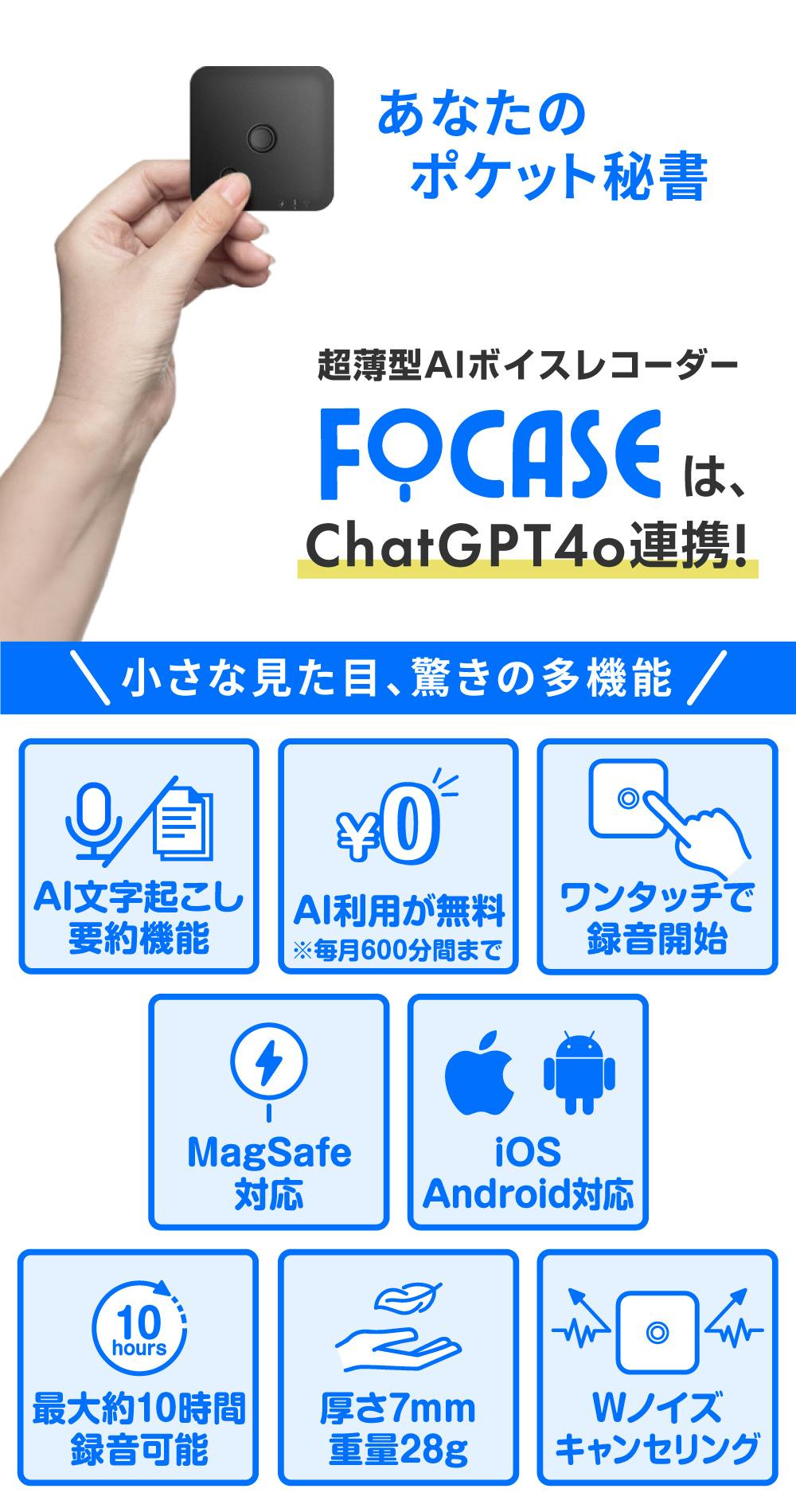 当社、オスカージャパン株式会社は、「人々がより便利で幸せな生活を送れることをサポートする」をミッションに掲げて活動しております。「FoCase」ChatGPT4o 連携AIボイスレコーダーは、長時間の会議や講義、メディア取材など、文字による記録が必要なシーンが多く存在します。これまで多くの方々が、大量の時間や労力を費やしてきたのではないでしょうか?この商品は、そうした問題に直面する人々を支援するために開発されました。