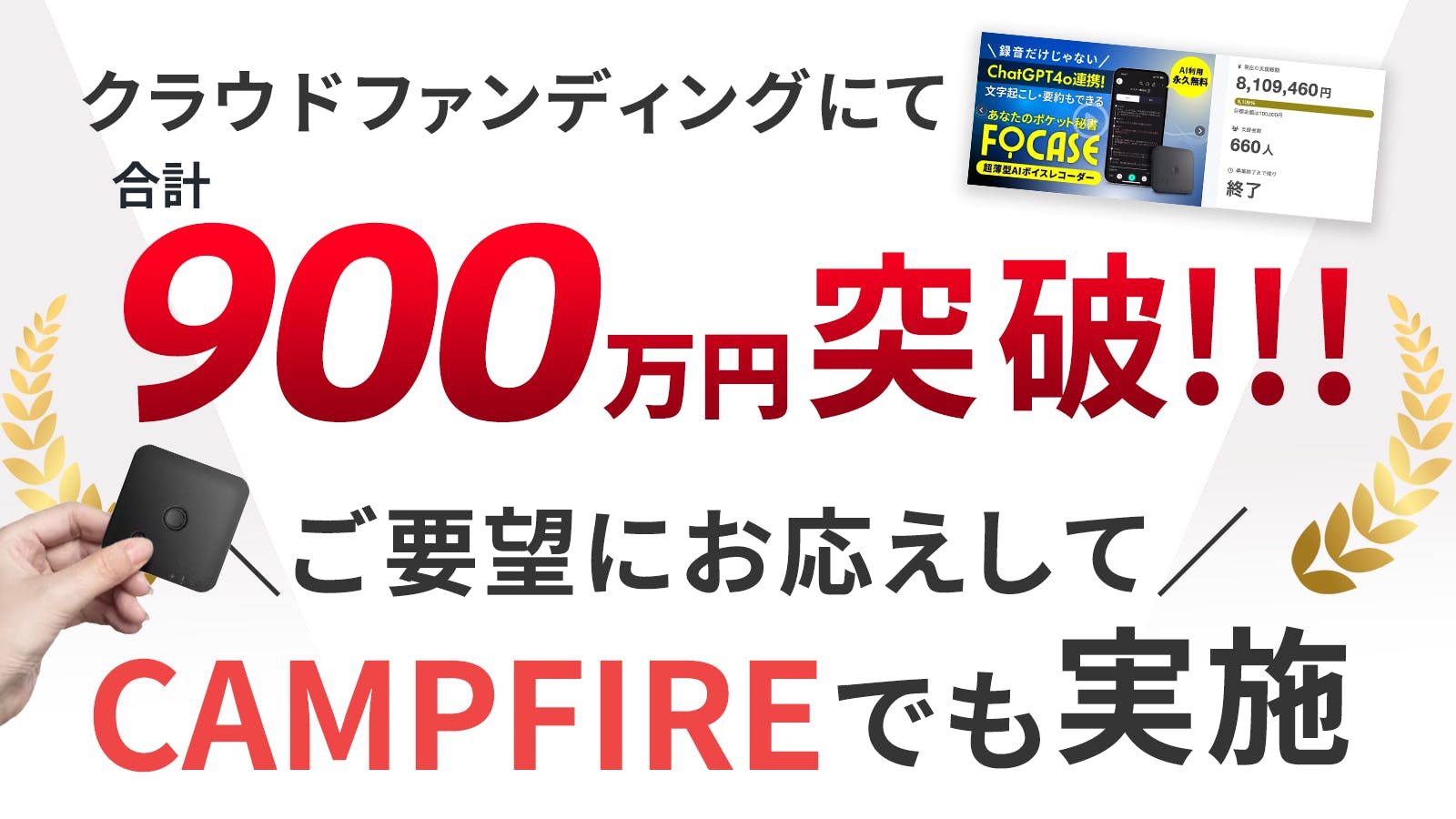 先日、先行販売を終えた「FoCase」超薄型AIボイスレコーダーは、話題を呼び先行販売開始初日から大盛況で、わずか1か月ほどの販売期間でしたが、おかげさまで、支援者数660人、支援金額が800万円を超える大成功を収めることができました!皆様の温かいご支援に心より感謝申し上げます。