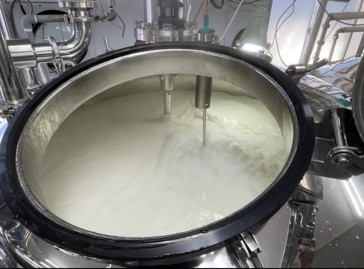 パスチャライザーの中でかき混ぜながらゆっくりと加熱される牛乳、これがパスチャライズ
