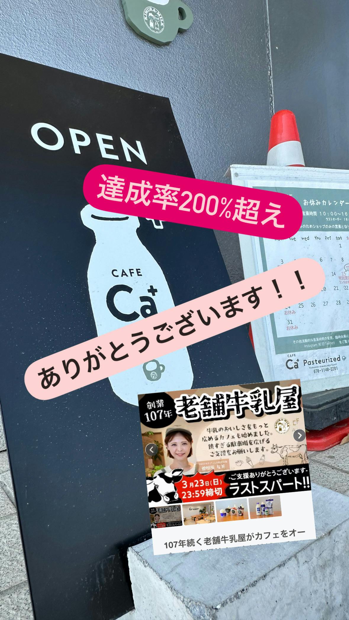 2025/03/26 10:15ご支援ありがとうございました!!こんにちは!Cafe Ca+Pasteurizedの曽根原です!この度は木村牛乳直営店Cafe Ca+のクラウドファンディングプロジェクトにご協力いただきましてありがとうございました!おかげさまをもちまして、最終達成率は227%となりました!!当初の目標を大きく超えてのご支援をいただき社員一同心より御礼申し上げます。木村牛乳がこんなにも多くの皆様に愛されていることを実感した2ヶ月間でした!集まったご支援金額は、Cafe Ca+Pasteurizedがより多くの皆様の憩いの場となれるよう改修費となります。メインは駐車場の拡張となるんですが、こちらの活動報告でも随時進行状況を発信していきます!皆様お待ちかねのリターンの発送については4月中旬をめどに発送を開始致しますので少々お待ちくださいませ!それでは引き続き木村ミルクプラントとCafe Ca+をよろしくお願いいたします! もっと見る