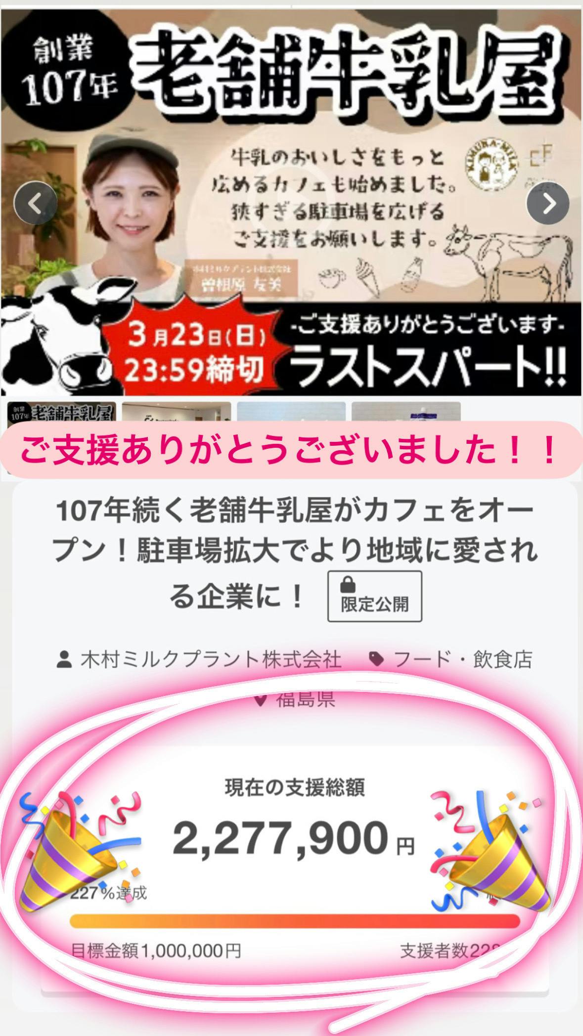 2025/03/20 17:42こんにちは!Cafe Ca+ Pasteurizedの曽根原です!クラウドファンディングプロジェクト終了まで残り3日となりました...!約2ヶ月間の募集期間を経てここまであっという間でした...ご協力くださいました関係者の皆様に深くお礼申しあげます!そして現在の達成率は.....達成率190%!!ここまでご協力いただき本当にありがとうございます!まさかまさかの190%までご支援金額を伸ばすことができました♡これもひとえに木村牛乳を愛してくれる皆様のおかげです!ですが我々のゴールは皆様ご存知ですね??そう200%のネクストゴールを目指しています!残り日数も3日となりました。ここまでご協力いただいた皆様!最後のお願いです!何卒このプロジェクトをより多くの皆様にお伝えください!皆様の応援が木村牛乳の力になります!品切れとなっていた返礼品も再度追加し、より多くの皆様にお渡しする準備もできております!残り3日何卒温かい応援をお願いいたします! もっと見る
