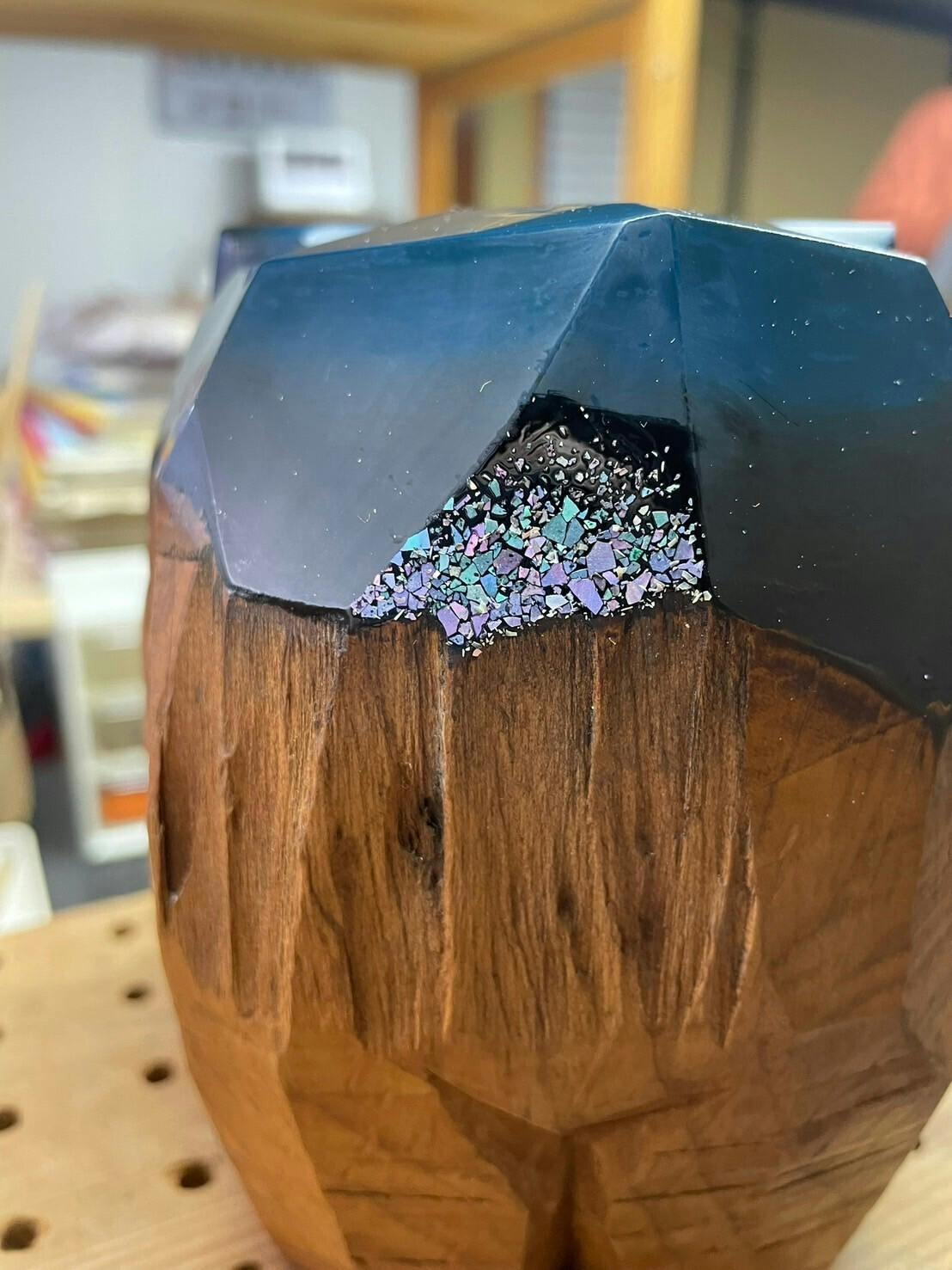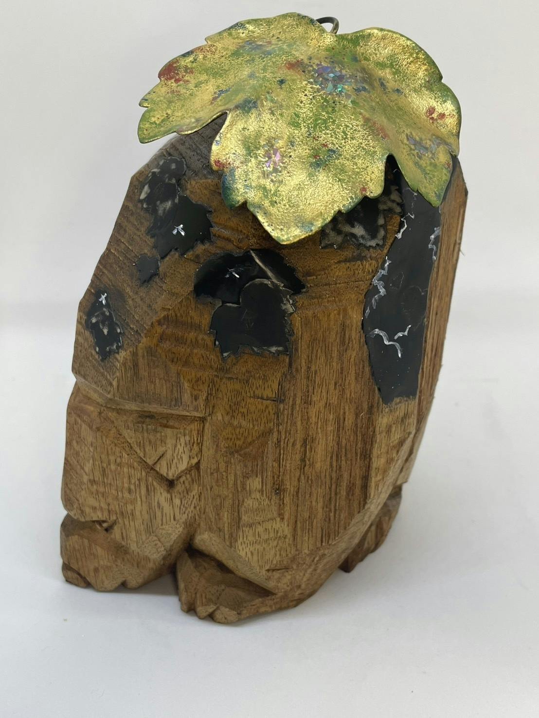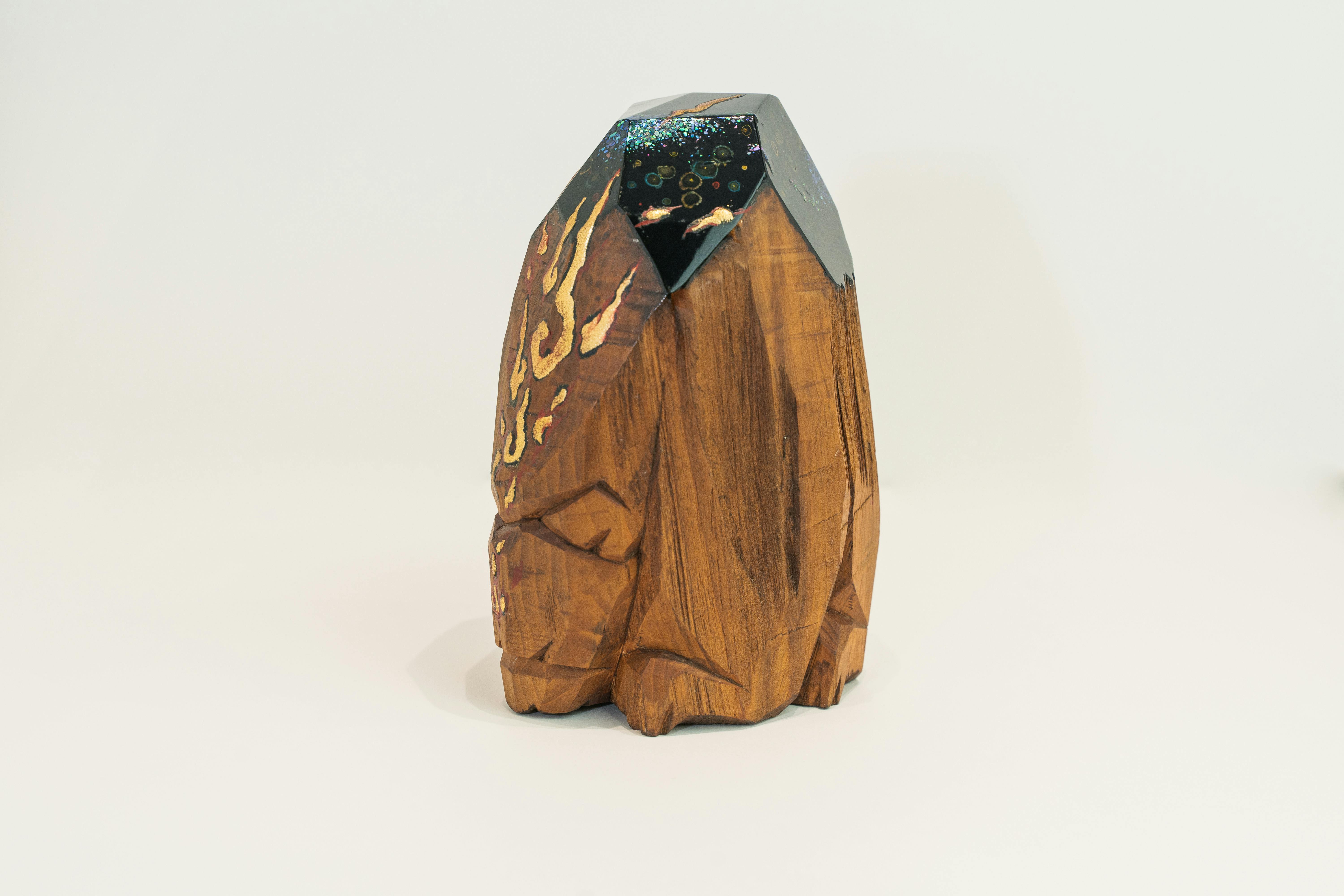 2025/03/17 23:56本日は木彫り熊三体のうち一作品の「芽吹き」をご紹介させてください!「芽吹き」漆芸の伝統技法を駆使し、生命の芽吹きを表現した一体。下地から丁寧に施し、螺鈿(らでん)の技法を用いて貝をふんだんにあしらいました。キラキラと光る貝の輝きの中でも特にピンク色の部分を選び青色に変化していく様、背中の中央から徐々に青から黒へとぼかしていくグラデーションを施しています。これは「ぼかし塗り」と呼ばれる技法を用いたものです。また、黒蝋色(ろいろ)の漆と金属粉(すず粉)を蒔き、緑色の乾漆粉を用いることにらより苔のような質感を演出。さらに、金粉を指で練り込むことで、苔の黄色い部分を表現しました。表面は滑らかな部分とざらついた部分が共存し、奥行きのある仕上がりとなっています。蝶々は軽やかさを重視し、金属ではなく麻布を使った乾漆技法で仕上げ銅線を用いて差し込み、足や触角はステンレスの釘を0.2ミリの細さまで削り漆を焼き付けて漆を定着させています。羽は青と金のコントラストが鮮やかに映え、装飾の華やかさを際立たせ繊細に仕上げています。羽の黒い斑点は螺鈿ではなく漆で描かれたものであり、熊の背中の波模様は能登の荒波をイメージしました。 もっと見る