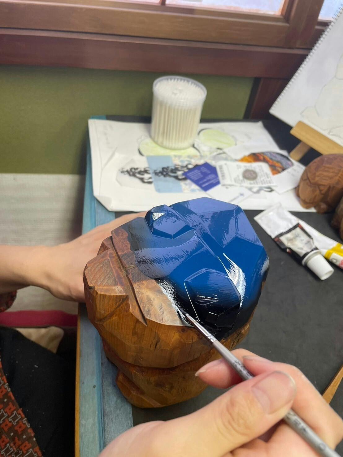 輪島塗には古くから伝わる伝統的な技術があり、八雲の木彫り熊は愛らしい表情とモダンなつくりから海外からも人気が高く、自由に創作できる面白さを感じていました。そこで2人の職人さんが出会い、輪島塗と木彫り熊がコラボレーションしたら、きっと新しい形での復興ができるのではないかと考え、早速私は輪島と八雲に出向き、お話しをすることから始まりました。