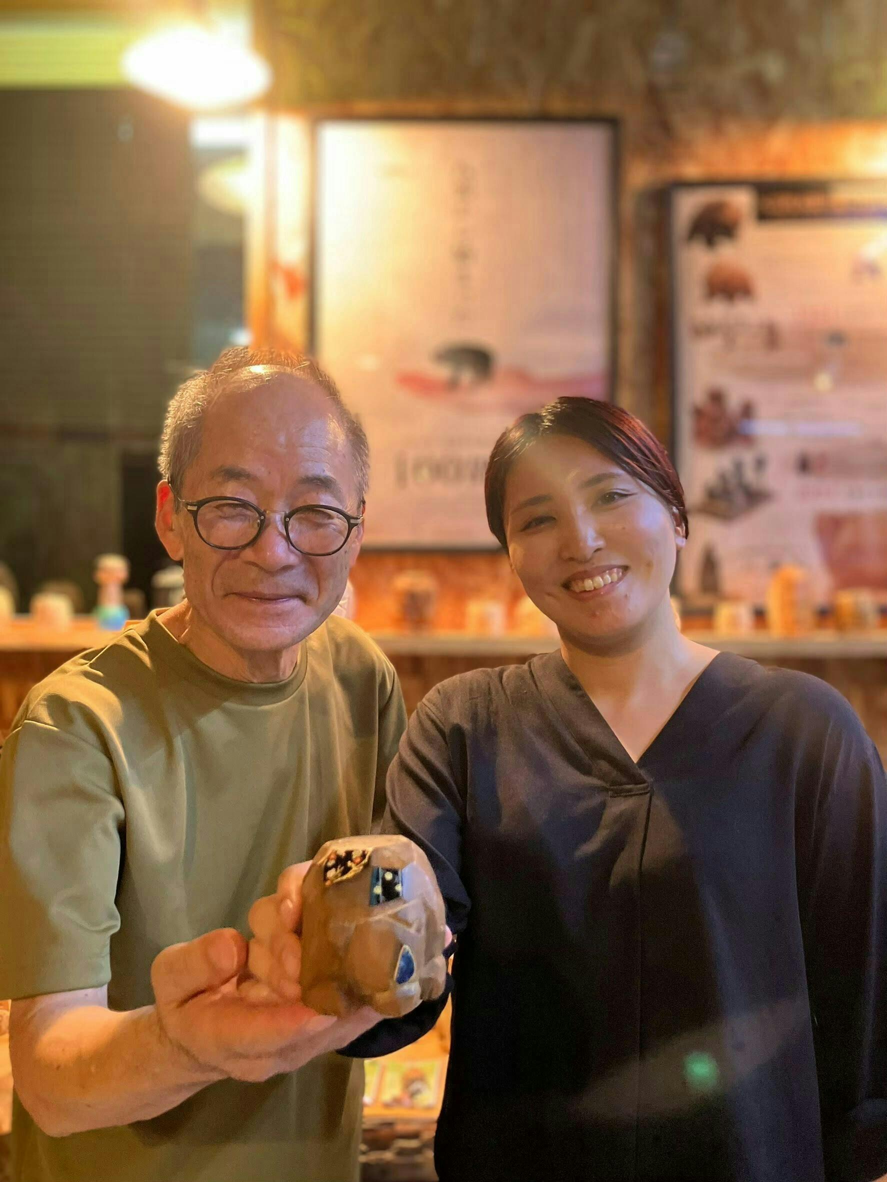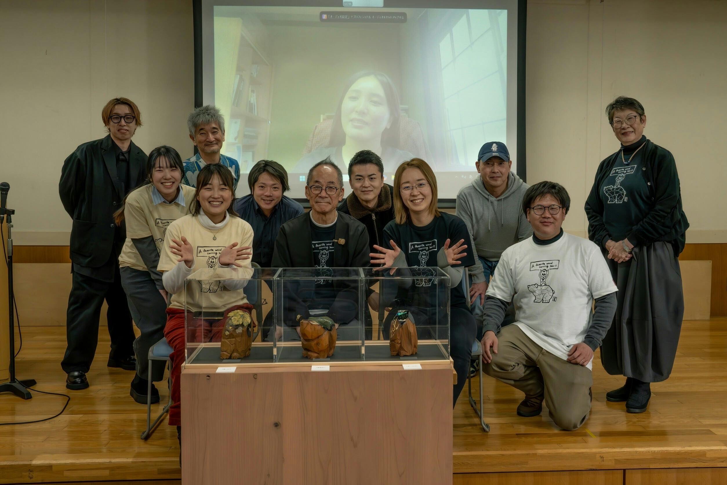 二人が持っている木彫りくまは、わじま熊の試作品です。木彫り熊に輪島塗を施すとどのようになるのかを、試作する一歩から私たちは始まりました。大森さんに制作をお願いしてから、想像することのできない熊さんが出来上がりました。小熊さんも私たちも感動しました。