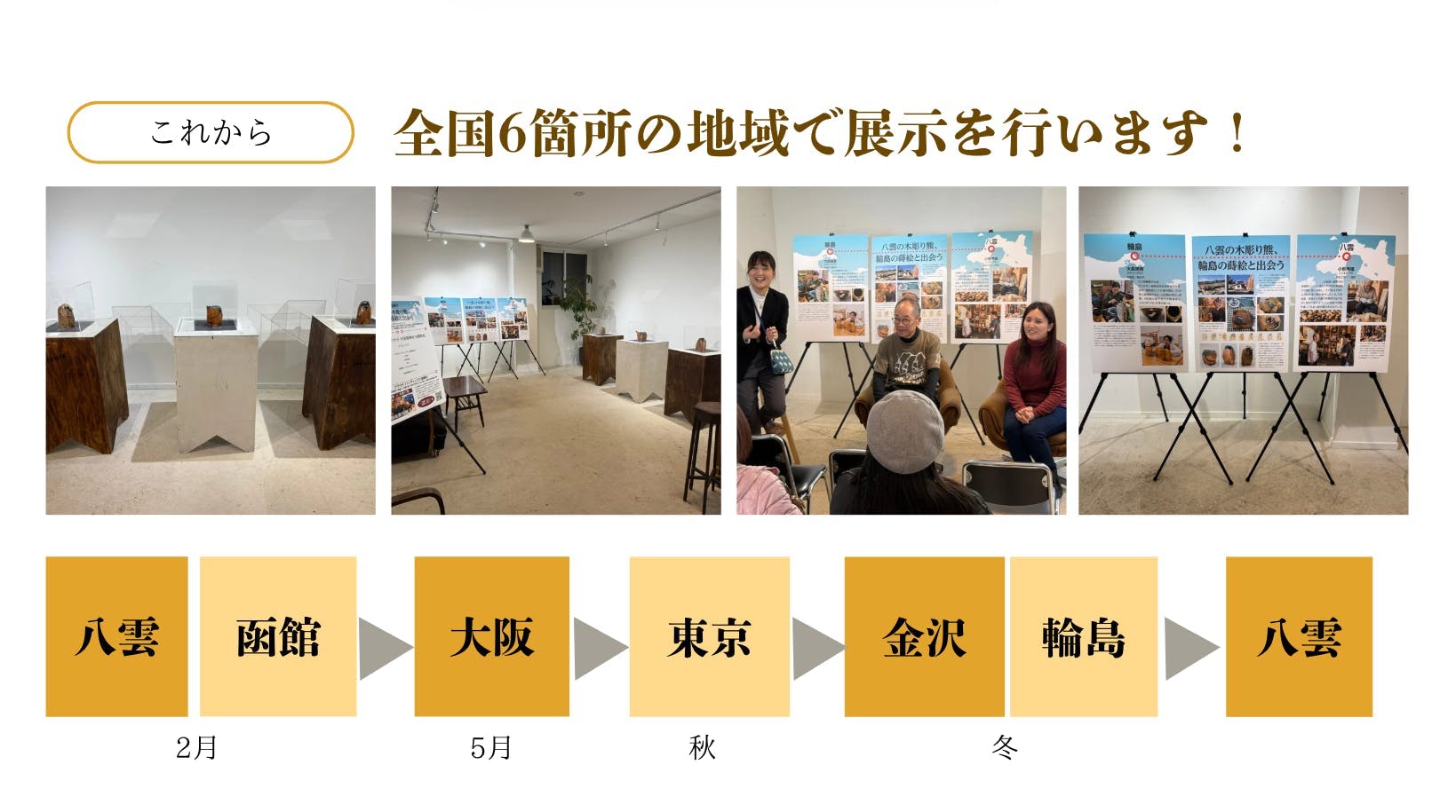 このプロジェクトでは、大森さんをはじめ、輪島塗の本当の復興を目指し、輪島塗と今まで出会うことのなかった木彫り熊をコラボさせることで、新しい価値を創出し、全国4箇所で展示会を行い全国に発信します。
