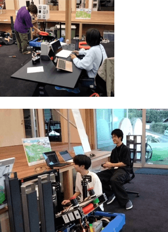 ハード班では、スワーブという高度なタイヤの機構の研究や、ロボットをスムーズに動かすためのカメラ開発を行っています。一方、ソフト班では、スワーブを制御するプログラムや、カメラで検知した情報をもとに自動運転を実現するプログラムの開発を進めています。