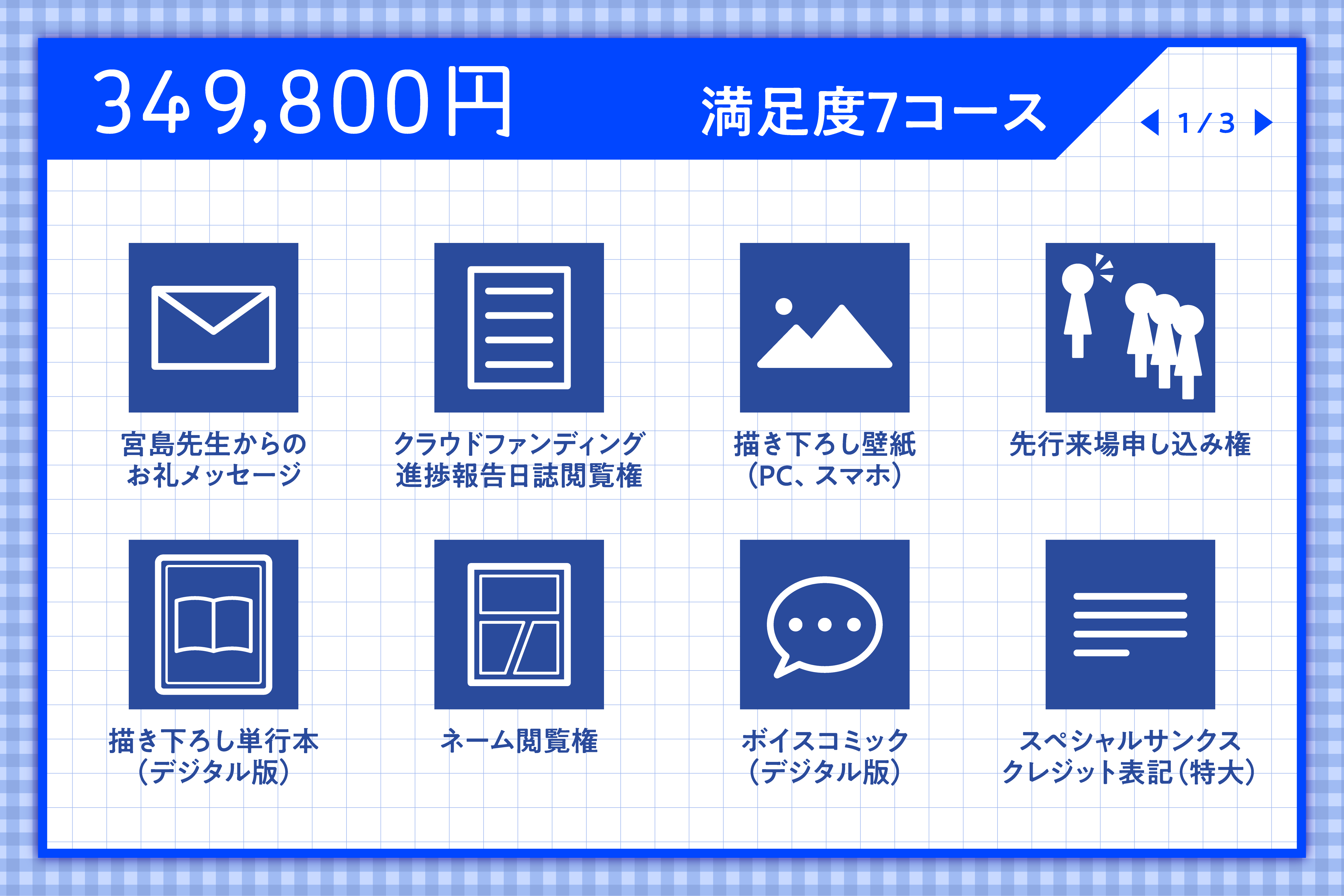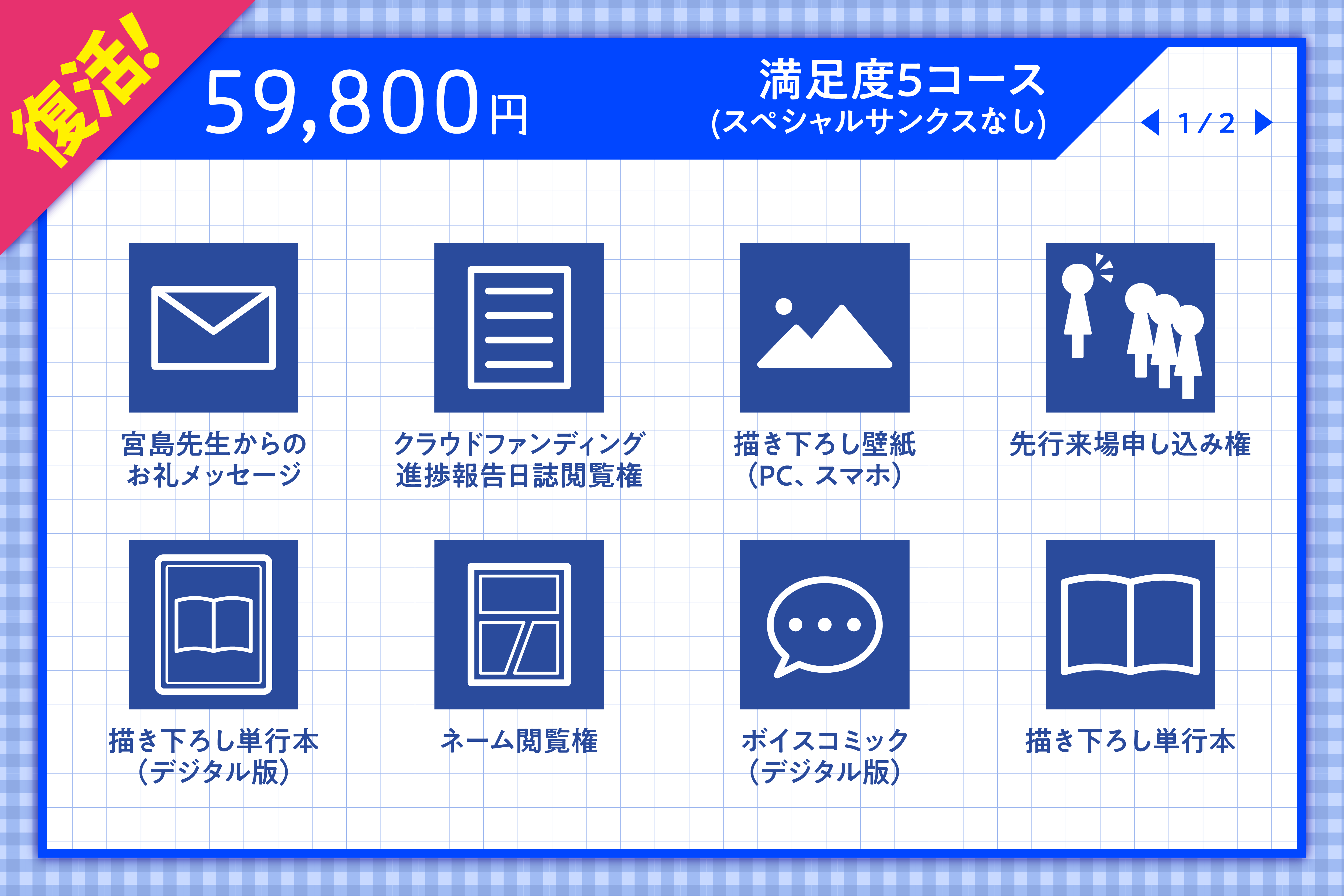 満足度7・8コースの方は、リターン品に「トークショー参加券」を追加いたしますので、トークショープランとの重複購入にお気をつけください。
