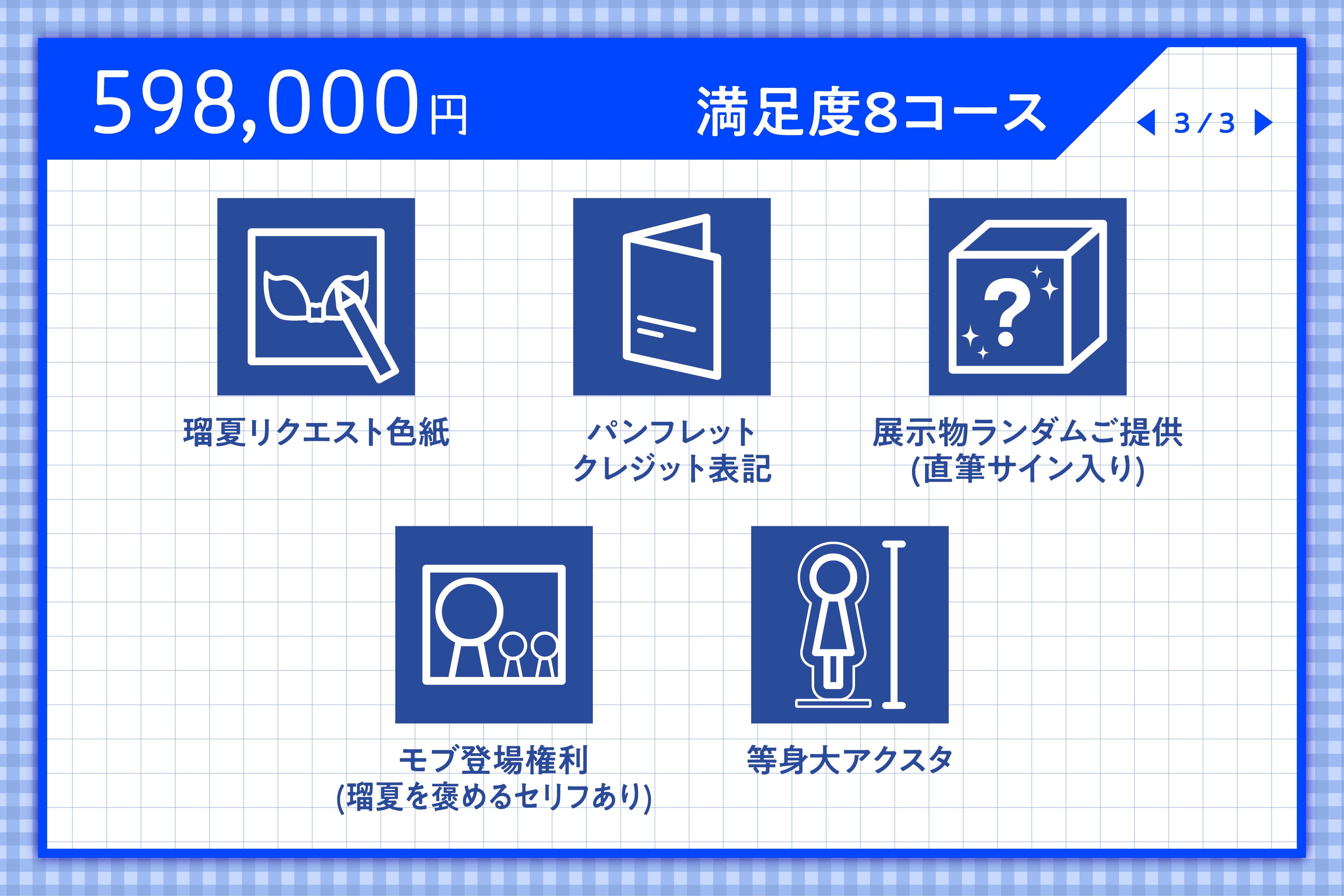 内容:今回の描き下ろし単行本での瑠夏と和也のデートを再現した、体験型の展示となっております。二人がデートに行ったゲームセンターがベースの空間となっており、クレーンゲームやプリクラ等のコンテンツをご用意しております。基本的に予約でのご案内を想定しており、支援いただいた方以外もご入場いただけます。満足度2以上のコースをご支援いただいた方は先行来場予約をいただけますので、ぜひご活用ください。