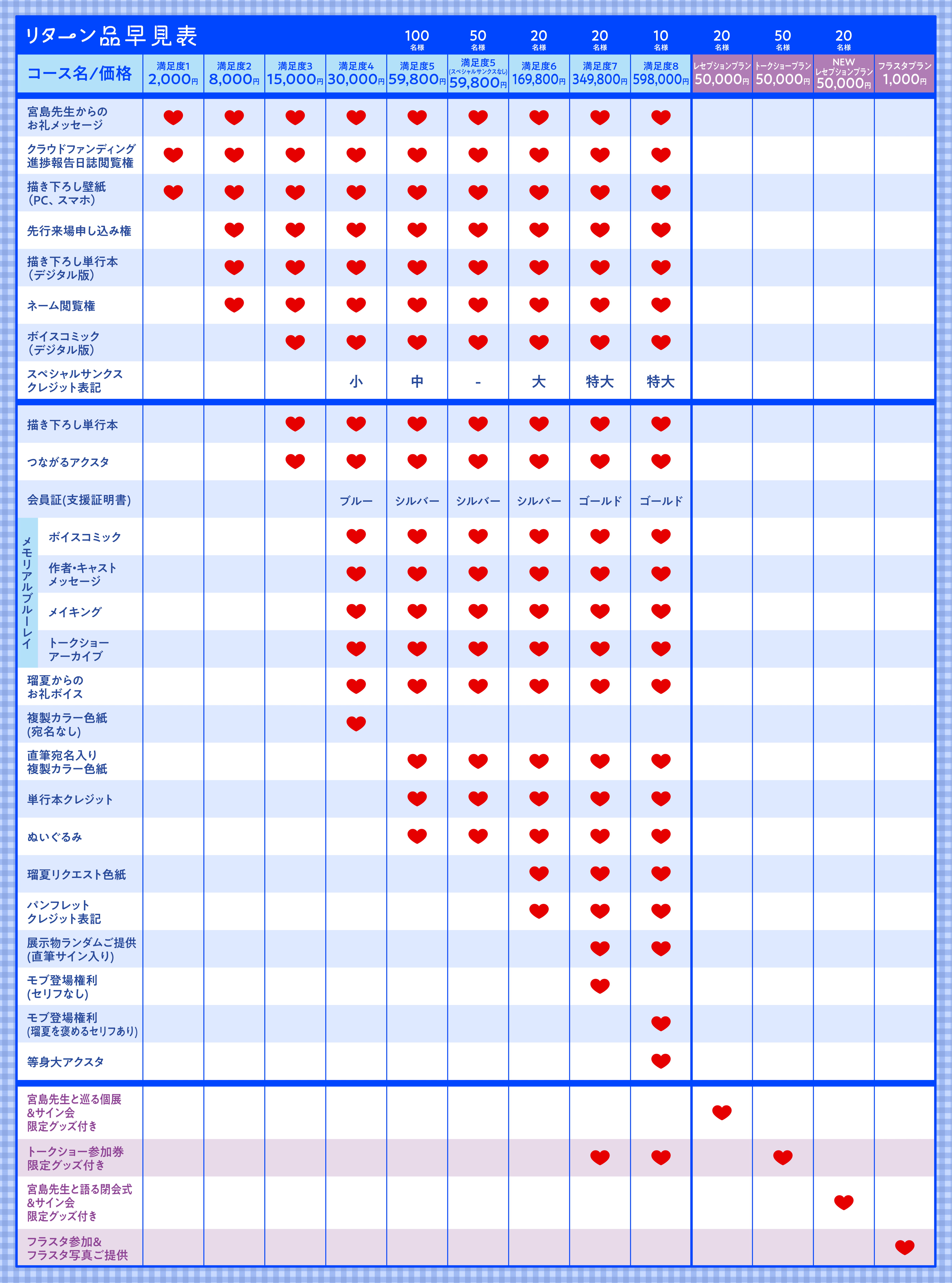 なお、復活した満足度5コースですが、掲載枠の関係上、今回の募集ではスペシャルサンクスの掲載は無しでのご案内となりますことを予めご了承ください。