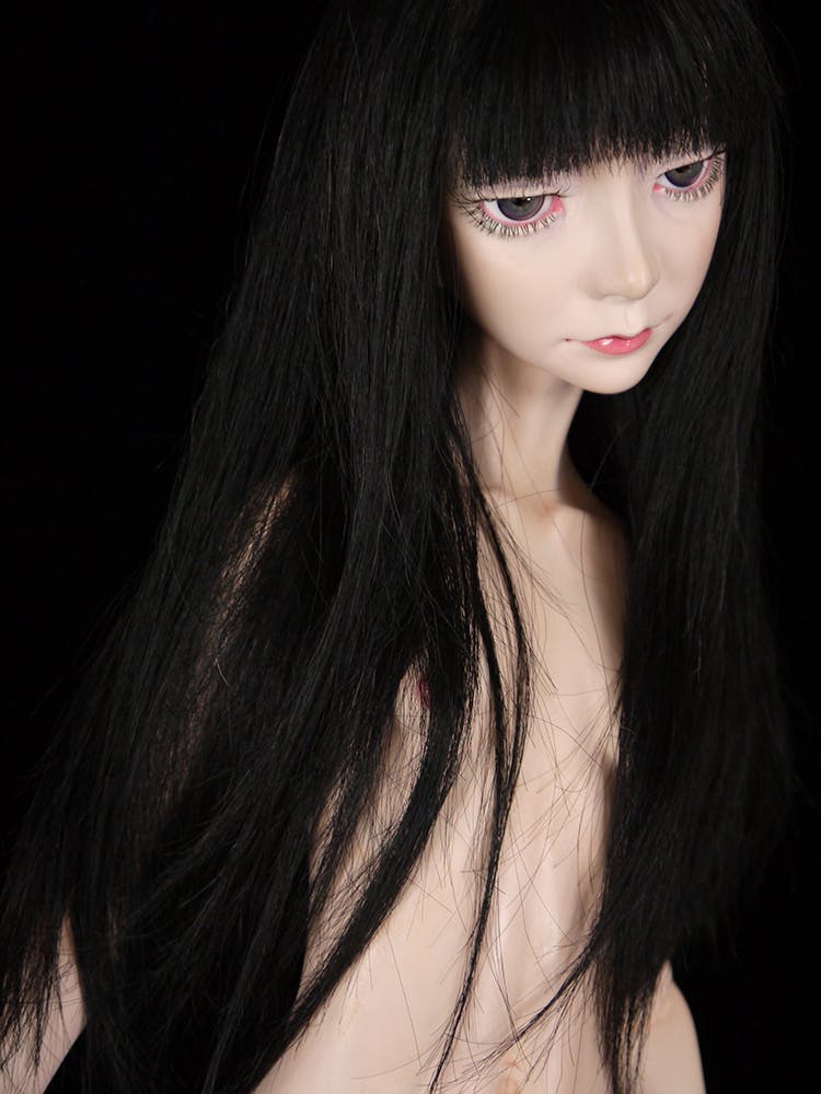 石粉粘土胡粉仕上げ、人髪使用、鉱物アイ(Galena/方鉛鉱)使用
