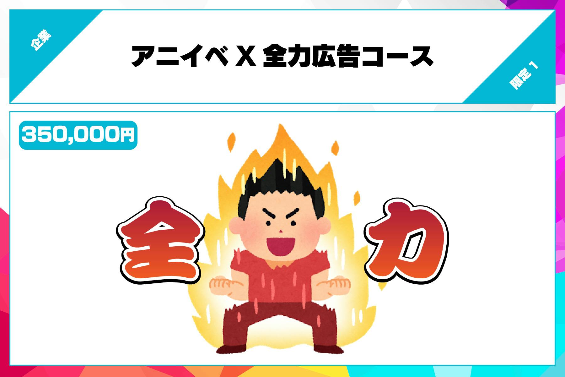 ・アニイベX 内に設置される地域ページ(対象:「北海道・東北」「関東」「中部・北陸・甲信越」「近畿」「中国・四国」「九州・沖縄」の6カテゴリー)(実際にイベントを開催する都道府県の地域への掲載)ページトップに設置されるの広告枠部分に、あなたの主催イベントの情報へのリンクと画像を、イベント開催の3週間から開催日まで設置します。