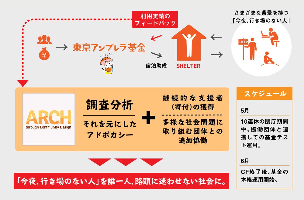 2019/08/15 13:57お世話になっております。東京アンブレラ基金事務局です。みなさまのご支援のおかげをもちまして「東京アンブレラ基金」は8月より正式運用をスタート。各協働団体への緊急宿泊費の提供と調査分析を始められる運びとなりました。改めまして御礼申し上げます。今後の運用実績や途中での進捗につきましても、本日オープンいたしました東京アンブレラ基金のウェブサイト ( https://umbrellafund.tokyo/ )を中心として、つくろい東京ファンドの各SNSでお伝えしていく予定です。こちら是非ご覧いただけますと幸甚です。●東京アンブレラ基金ウェブサイトhttps://umbrellafund.tokyo/●つくろい東京ファンド Twitterhttps://twitter.com/tsukuroitokyo●つくろい東京ファンド Facebookhttps://www.facebook.com/tsukuroitokyo正式スタートに伴い、住まいを失った方への直接支援と、基金を通じて支援に繋がった方のデータ集計をおこない、見えにくい形での「ホームレス」の実態を明らかにしていきます。また、変化の速い社会問題に対応していくため、アンブレラ基金自身もアップデートしていきます。どうか引き続き「東京アンブレラ基金」をご注目いただけますよう、お願い申し上げます。 もっと見る