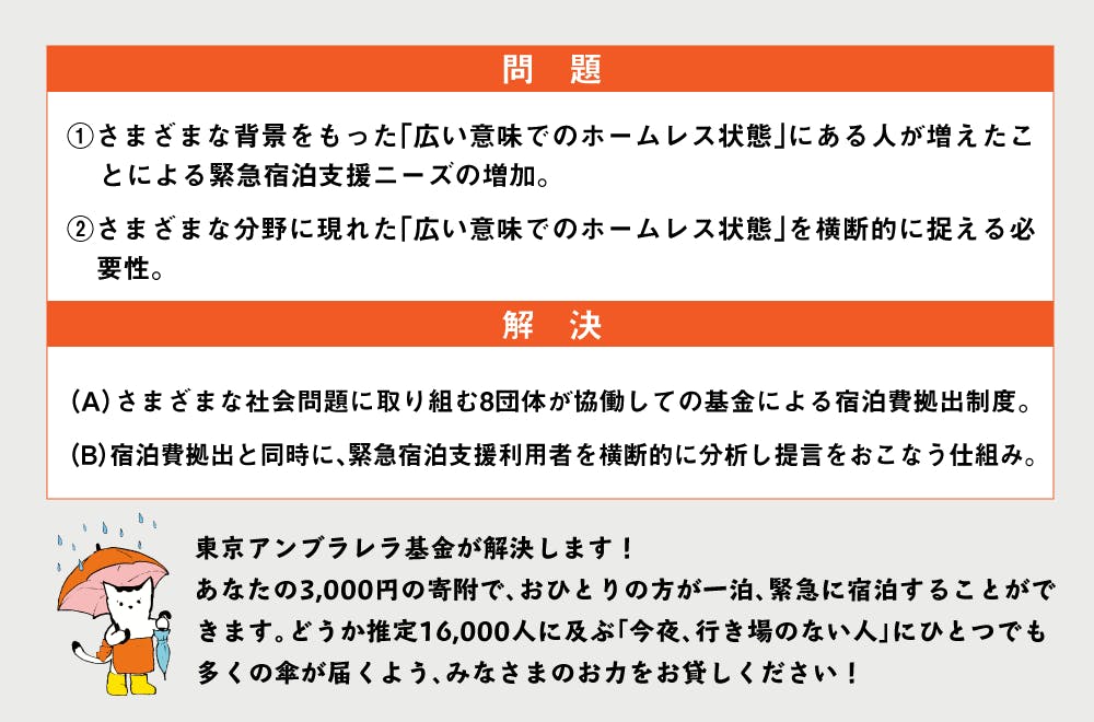 緊急事態に陥った人たちに、今夜の雨から身を守るための「傘」を差し出すための基金です。