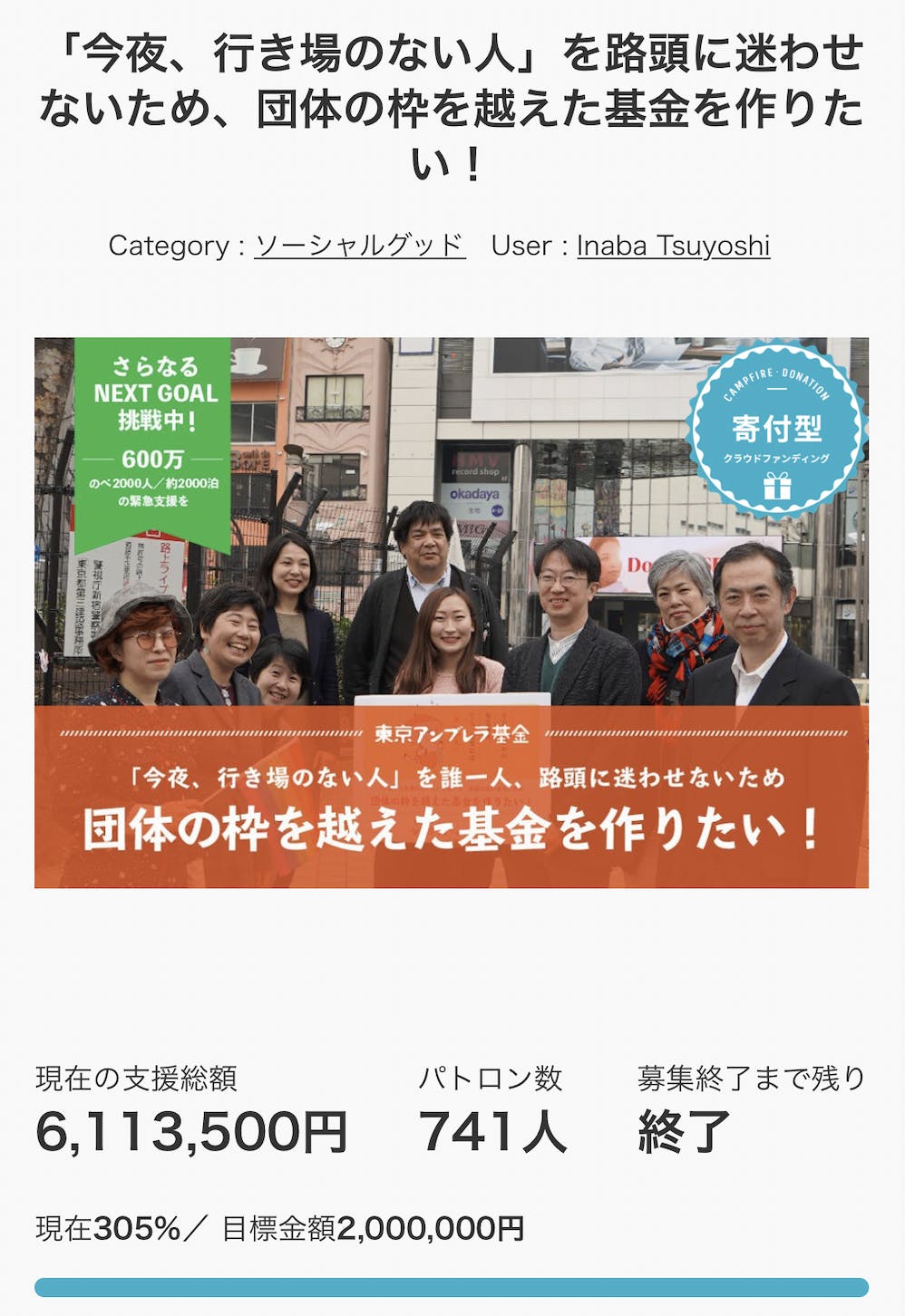 2019/06/16 23:58さまざまな事情で安定した住まいを失った「今夜、行き場のない人」へ、緊急宿泊支援の提供と調査をおこなう「東京アンブレラ基金」設立のためのクラウドファンディング。15日23時59分に終了し、741人の方から当初の目標金額を大幅に上回る6,113,500円のご支援をいただくことができました!これにより、のべ2000人(約2000泊)の緊急宿泊支援の提供が可能となりました。深く御礼申し上げます。クラウドファンディングは終了いたしましたが、基金の本格運用はこれから始まります。活用の様子や実績などにつきましては、引き続きこちらの活動報告ページや、つくろい東京ファンドのSNS、東京アンブレラ基金のnote( https://note.mu/umbrellafund )などで発信させていただきます。改めまして、ありがとうございました! どうか今後とも「東京アンブレラ基金」を応援いただけますようお願い申し上げます。 もっと見る