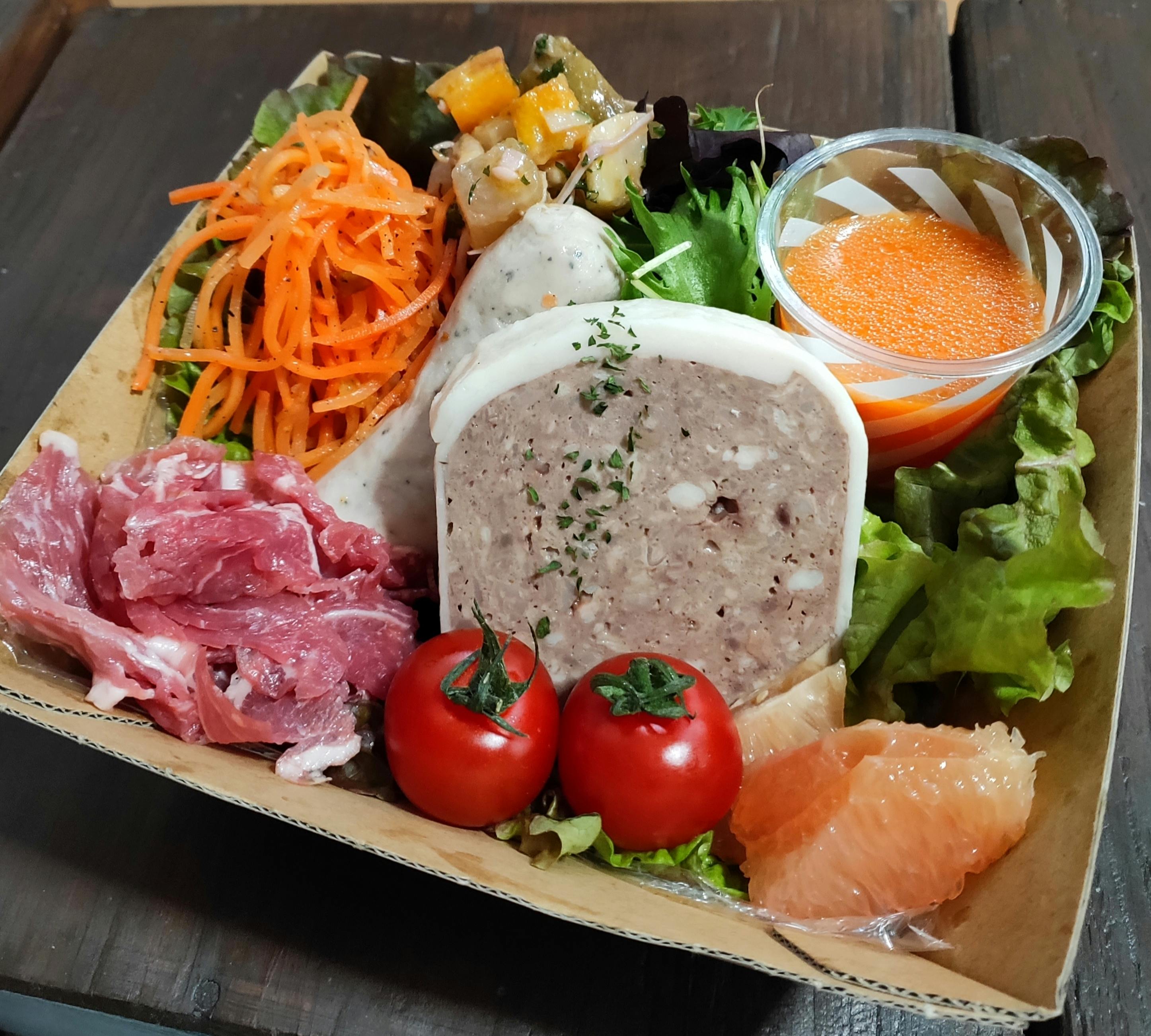 日替わり自家製シャルキュトリー、洋風惣菜、サラダなどを詰め合わせたおべんとうになります。