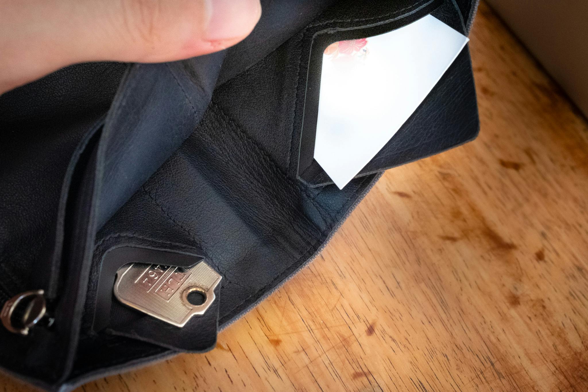 それぞれカードが1枚と、鍵が1枚入ります。カードポケットはSUICAなど、頻繁にタップするICカードを入れるのにピッタリです。