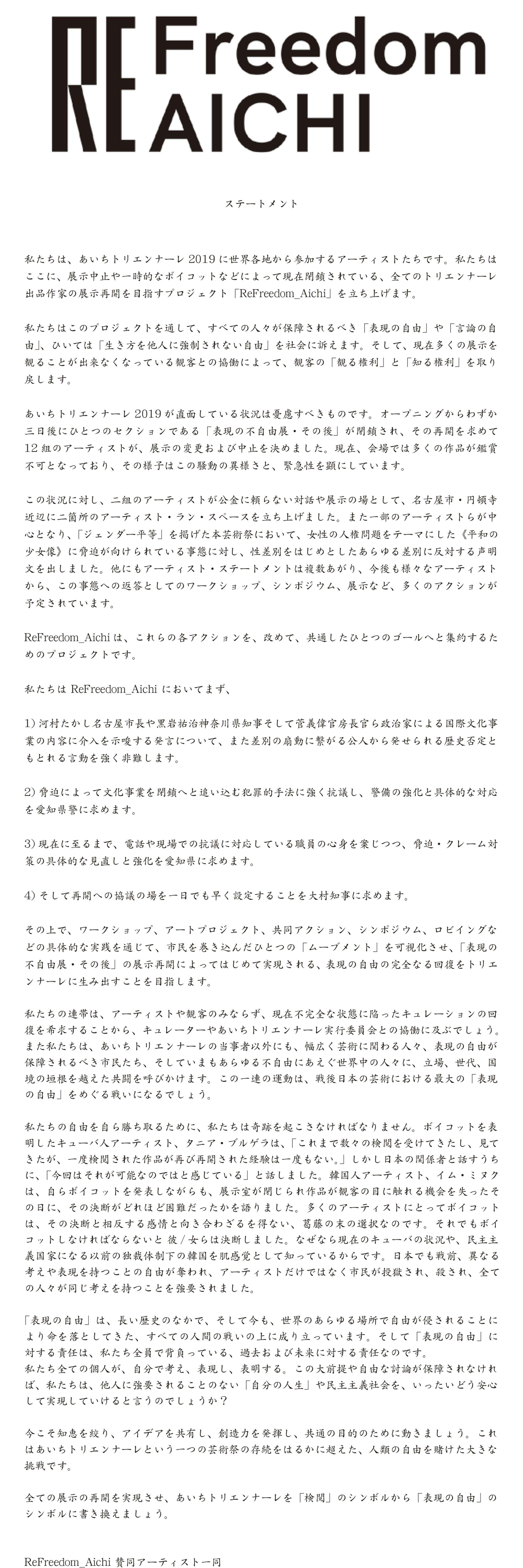 8/6 参加アーティスト72組がステートメントを発表。「芸術祭の回復と継続、自由闊達な議論の場」求める。