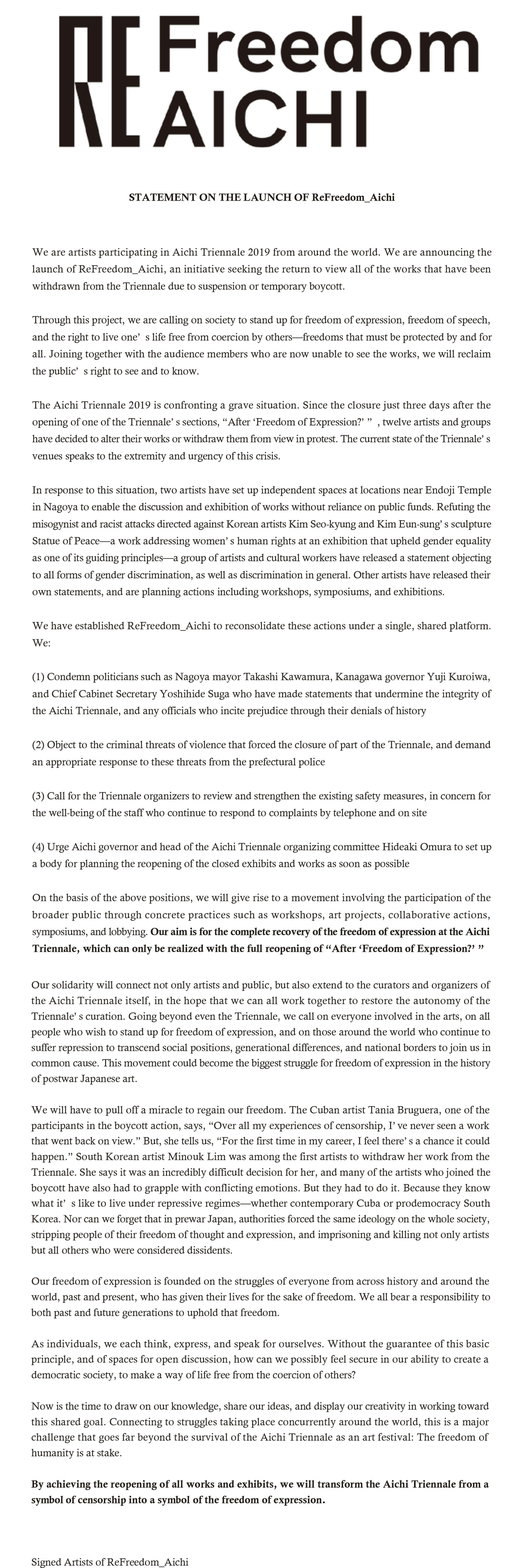 ReFreedom_Aichi is an initiative seeking the resumption of all closed exhibits and the complete recovery of free expression at the Aichi Triennale 2019. We aim to consolidate the various actions that artists are already taking in response to the situation in the name of a focused effort toward this objective. ReFreedom_Aichi will provide a “framework” for engagement among the artists involved in negotiations for the reopening, and ensure that the voices of the artists and public are heard at the negotiating table.