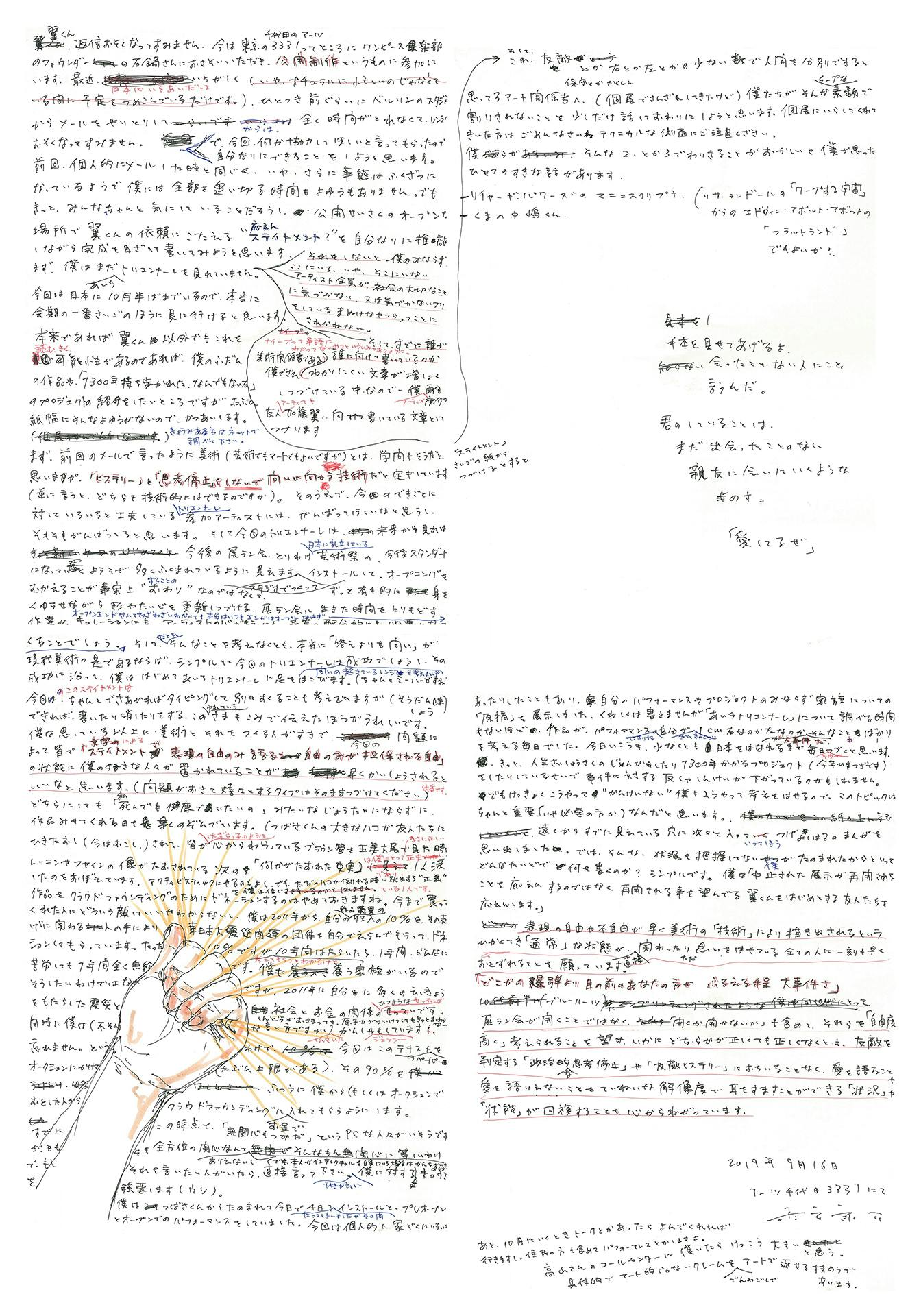 - 雨宮庸介(アーティスト)応援メッセージ2019/09/24 01:03「最近時間が取れなくて、あいちの方の動きをチェックする時間もないし、返信するの遅くなりました。ちょうど頼まれた公開制作の、人が見ている2時間を文章を考えて推敲する時間にあてました。時間が足りなくて乱筆ごめんなさい。終わったと同時にこれを読み上げ、パフォーマンスへと繋げるワンセットを行い(パフォーマンスの内容はご想像ください)、その場で販売し、クラウドファウンディングへの振込をその方に託しました。どう扱ってもいいのでお好きにしてください。タイピングした文章や英訳が必要なら言ってください。」雨宮庸介 もっと見る
