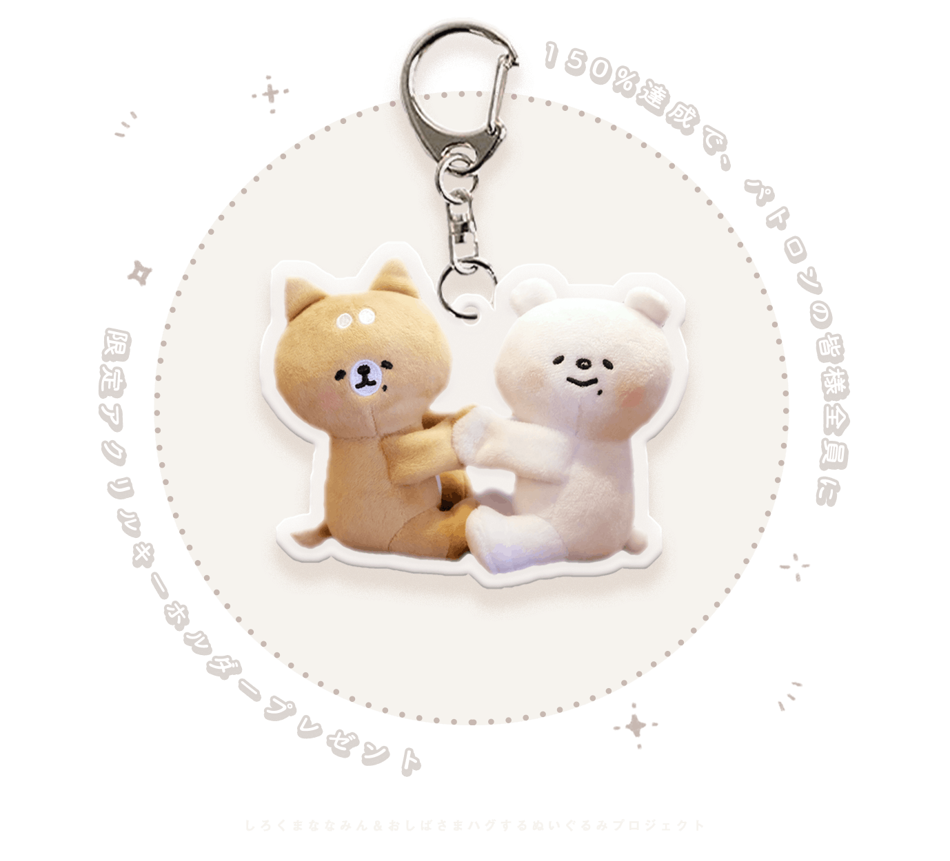達成度が150%を達成すると【 ご支援いただいた皆さま全員に 】ハグぬいアクリルキーホルダーをプレゼント!このプロジェクト限定デザイン、必見です。