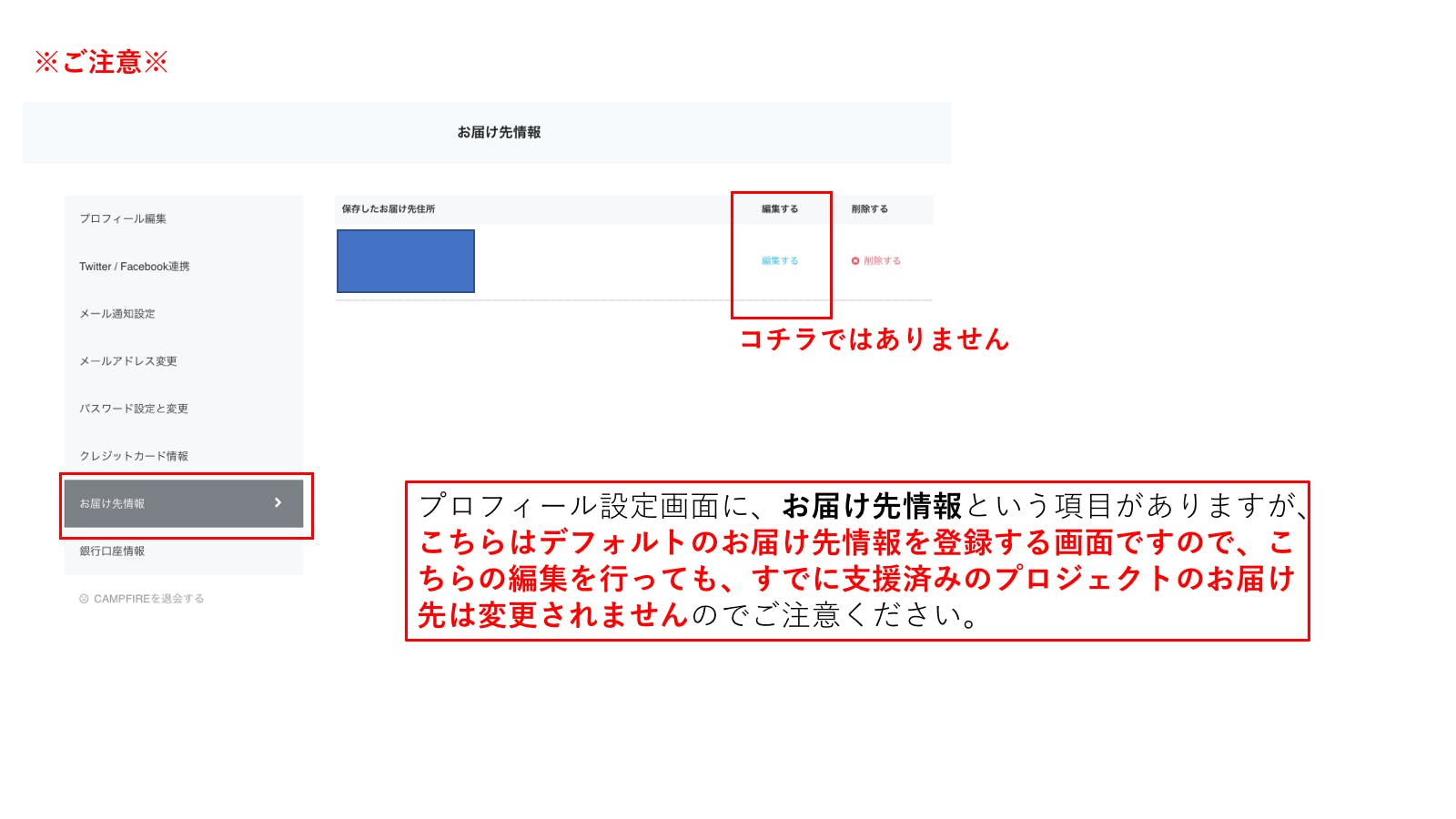 A:【会員登録が必須です】マイページ内の「支援したプロジェクト」にて「お届け先」→「確認する」より変更可能です。(プロフィールのお届け先情報の変更ではございません。ご注意くださいませ。)※下の画像を参考