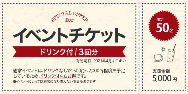 目標達成記念 リターン追加 第2弾 ワンドリンク付きイベント参加チケット 3回分