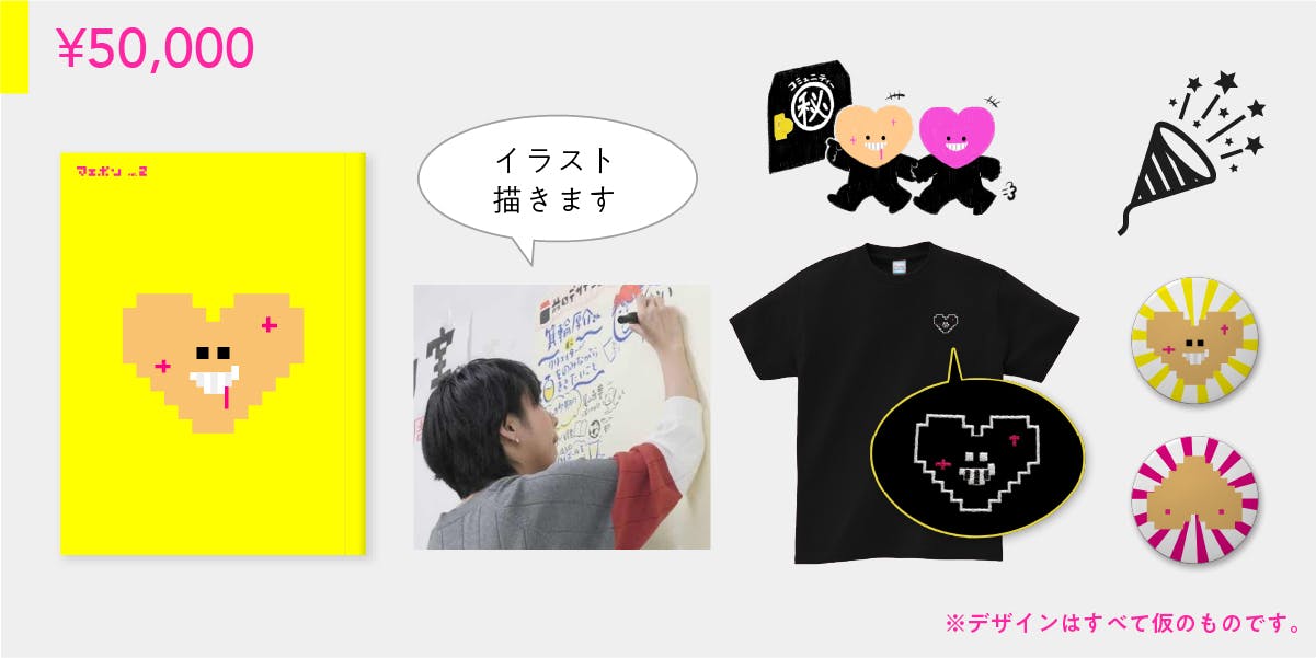 限定缶バッジ+Tシャツ+お披露目パーティー(定例会)参加券+カラーイラスト or グラレコ出張 50,000円(税込、送料込み)