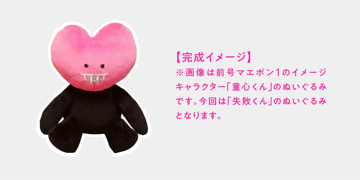 マエボン2のマスコットキャラクター「失敗くん」のぬいぐるみ1つを宅急便でお届けします。前作『マエボン』で、販促用の童心くんぬいぐるみを、じゃみぃ立体化プロジェクトでじゃみぃのぬいぐるみを作った、布モノクリエイターakaneによるハンドメイドになります。