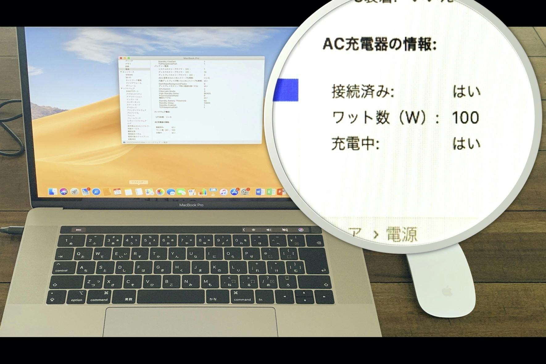 MacBook Pro15インチを充電した場合、約1時間半前後で80%以上まで充電できます。Macのパソコンは充電の電圧を確認することができ、「HYPER FACE」では100Wの給電を確認できます。