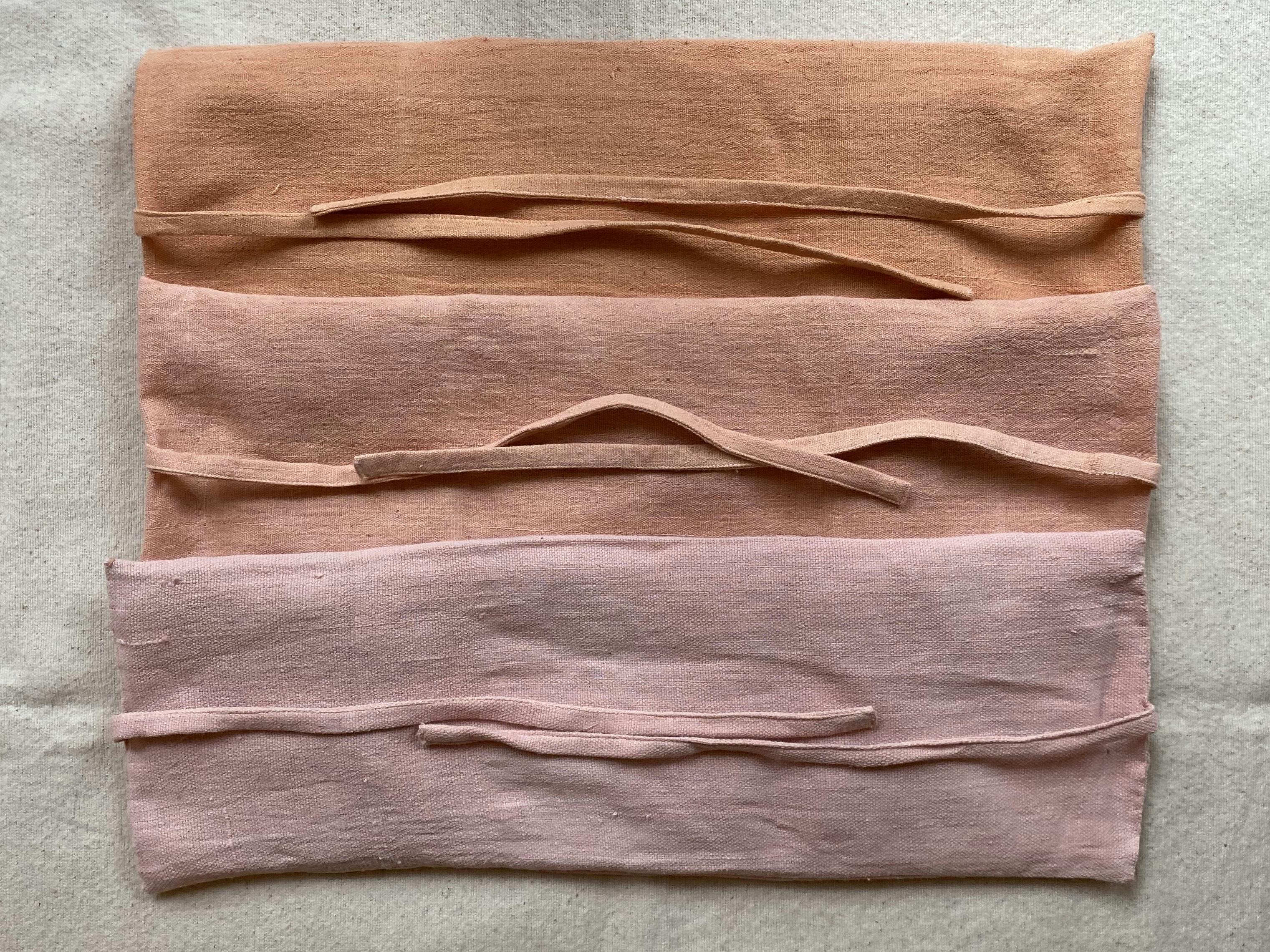 ●使用している材料 北海道産小豆・タイ産オーガニックハーブ (ジャワ ショウガ、ウコン、東インドレモングラス、タマリン ドリーフ、マクルゥリーフ、ガランガル、パオヤイ、 セイヨウオオバコ、クスノキ精油、ボルネオ樟脳) 内袋:綿布 外袋 :インドカディ(手織り)コット ン、染料:インド茜