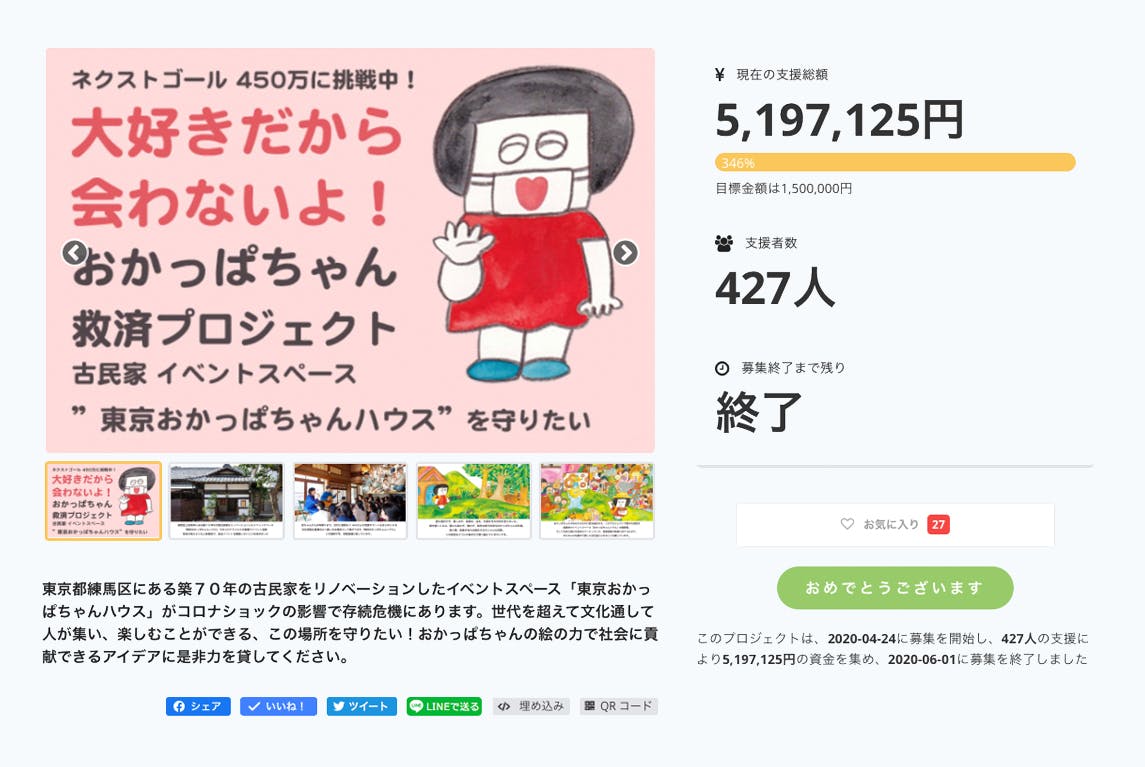 2020/06/02 11:02みなさん、こんにちは!お変わりありませんでしょうか。東京おかっぱちゃんハウスのBoojil、伊藤篤志です。40日間に渡り挑戦してきた、クラウドファンディングが昨夜無事終了しました。本日は、結果報告をさせていただきます。「存続危機!イベントスペース「東京おかっぱちゃんハウス」を絵の力で守りたい当初、お店の維持費3ヶ月分として掲げた目標金額1,500,000円を大きく上回り、427名様による支援「5,197,125円」が集まりました!!!!!!!!!!ご支援くださった皆様、本当に本当に有難うございます。想像を上回る結果に、私たちが一番驚いています。本日より、ご支援くださった皆様に、リターンの準備を進めてまいります。リターンによって、納期に差がありますが、年内に全てお送りできるように致します。お手元に届くまで、お時間をいただき大変申し訳ありませんが、どうぞ楽しみに待っていてください!改めて、この度は、東京おかっぱちゃんハウスのクラウドファンディングにご支援くださった方、この危機的状況に想いを馳せてくださった、お店に関係するアーティスト、作家の皆様、友人や、家族、お客様、地域の方、全てのみなさんに感謝いたします。コロナウイルスの影響により、今年3月下旬から予定していたイベントの相次ぐキャンセル、延期により一時は施設の存続が難しい危機的状況に陥りました。しかしながら、ご支援くださった皆様のおかげで、危機的状況を乗り越える光が見えてきました。ご支援くださった皆様の温かい励ましのお言葉を拝読し、気にかけてくださる皆様の存在に改めて気づかされ、感謝の気持ちでいっぱいになりました。みなさんの想いを胸に、どうにかこの場所を守ることができそうです。また、こんなにも多くの方がBoojilの作品をリターンとして選んでくださったこと、イラストレーターとして、活動してきた16年。こんなにたくさん絵を描く機会を持つことは初めてです。絵を仕事としている者として、こんなに幸せなことはありません。19歳の頃、初めてバックパッカーで旅をしたカンボジアとタイ。国境を越え、あの土地で出会ったストリートチルドレンの子供達。彼らと絵を描いて遊んだ経験から絵の道を志しました。赤土の道に、ボロボロの服を着た、裸足の少年と、拾った棒で絵を描いたことは今でも鮮明に覚えています。絵を描くことは、世界共通のコミュニケーションツール。言葉が通じなくても心を通わせることができます。あれからずっと、絵の仕事をして生きて生きたいと思って活動して参りました。一度も専門的な絵の勉強をしたことのない私でも、絵の仕事をして生きていける。改めてそう思わせてくださったのは、これまで応援してくださった皆様、そして今こうして支援してくださった皆様のおかげです。最終目標に掲げていた500万円という大きな金額。この目標に達したら、400万円以降集まった金額から経費を引いた支援より10%を「国連WFP」に寄付したいと考えていました。新型コロナウイルス緊急支援を募集している国連WFPは、飢餓と貧困をなくすことを使命とする国連唯一の食料支援機関です。国連WFPは国連最大の人道支援機関であり、唯一の食料支援機関です。食料に加えて医薬品やスタッフ等の輸送を、国連の中で一手に担います。災害や紛争時の緊急支援、栄養状態の改善、学校給食の提供などを活動の柱に、毎年約80ヵ国で女性や子どもなど8,000万人に食料支援を行っています。コロナウイルスの影響は日本だけでなく、世界全体におよんでいます。日本だけでなく、世界全体でこの状況を解決させないことには、将来またこのような状況に陥ることも想像できます。この支援については、わたしが長年の間思い描いていたBoojilの夢でもあります。絵を描いて、社会貢献をすることで、あの時であった子供達に恩返しがしたい。Boojilとして活動を始めて16年経った今、ようやく夢叶ったように思います。これからわたしが絵を描くことで、自分たちの暮らしだけでなく、日本の、地球の、どこかで困っている方の支援につながるような活動を今回のことをきっかけに始めたいと考えています。35歳、人生の折り返し地点、これからの指針が大きく変わりそうです。東京おかっぱちゃんハウスは、アートや音楽、文化活動に触れ、人と人が出会い、仕事や暮らしを豊かにするためのきっかけ作りになればと思い、スタートした場所です。現状況ではまだ多くの人を集めてイベントを開催することができませんし、通常通りの営業ができる日はまだまだ先になりそうです。まだまだ予断を許さない状況ではありますが、営業形態を一から考え直し、緊急事態宣言が解除された今月を準備期間として、7月から感染予防対策をしっかりした上で、3蜜にならないよう、少しずつ自主企画のイベントも開催していけたらと思っています。明けない夜はない。いつか終わりがやってきて、また新しいスタートを切ることができると信じています
