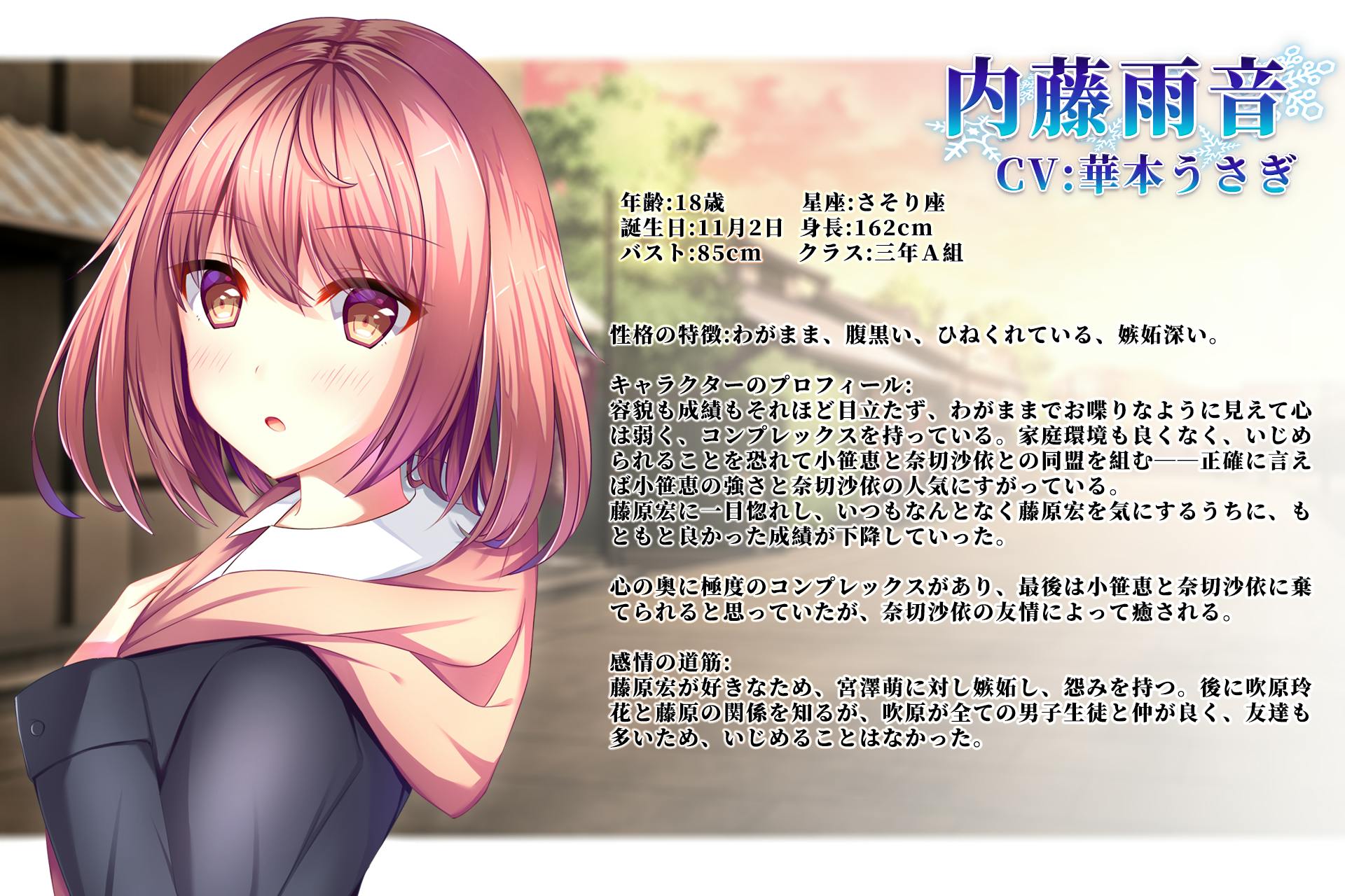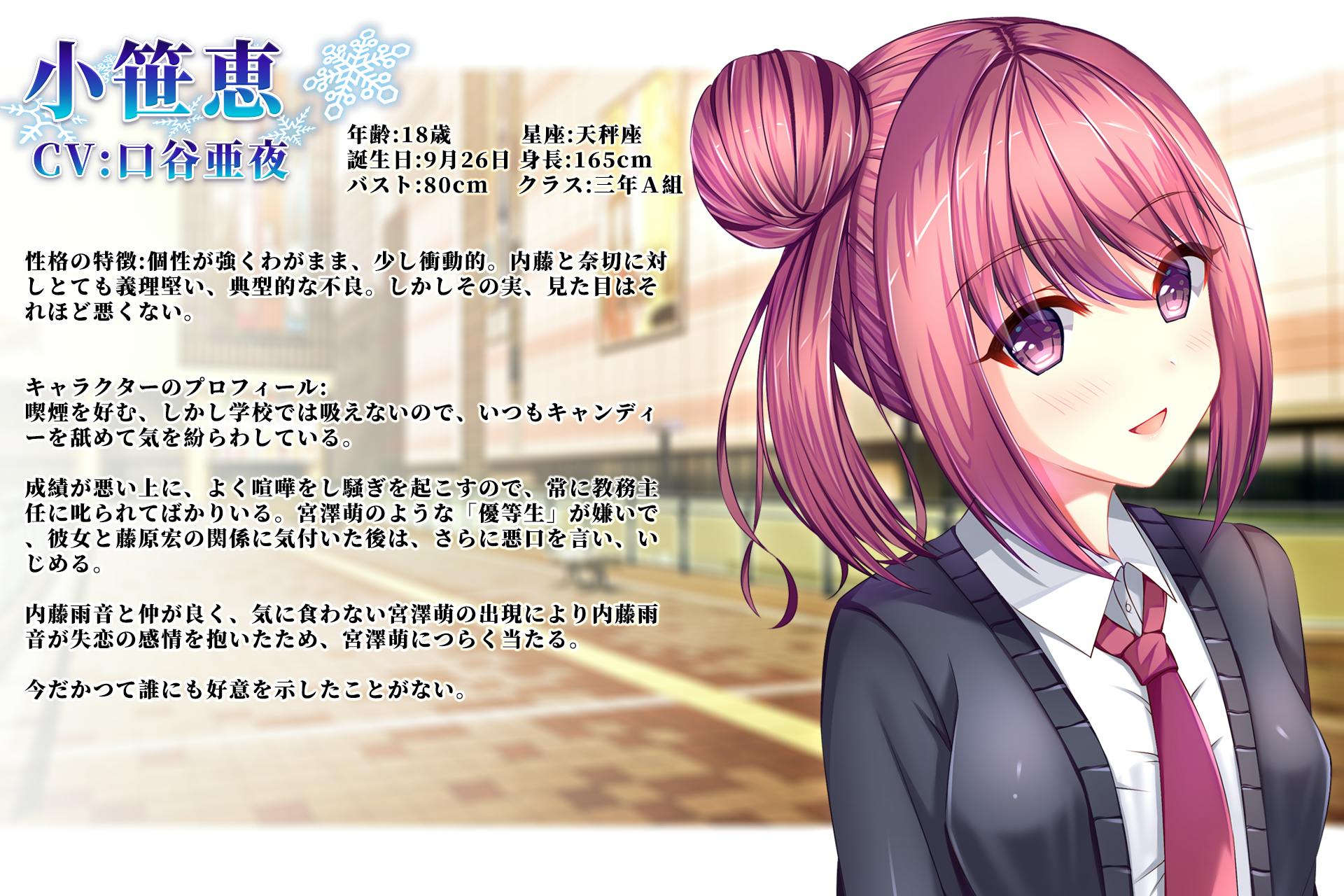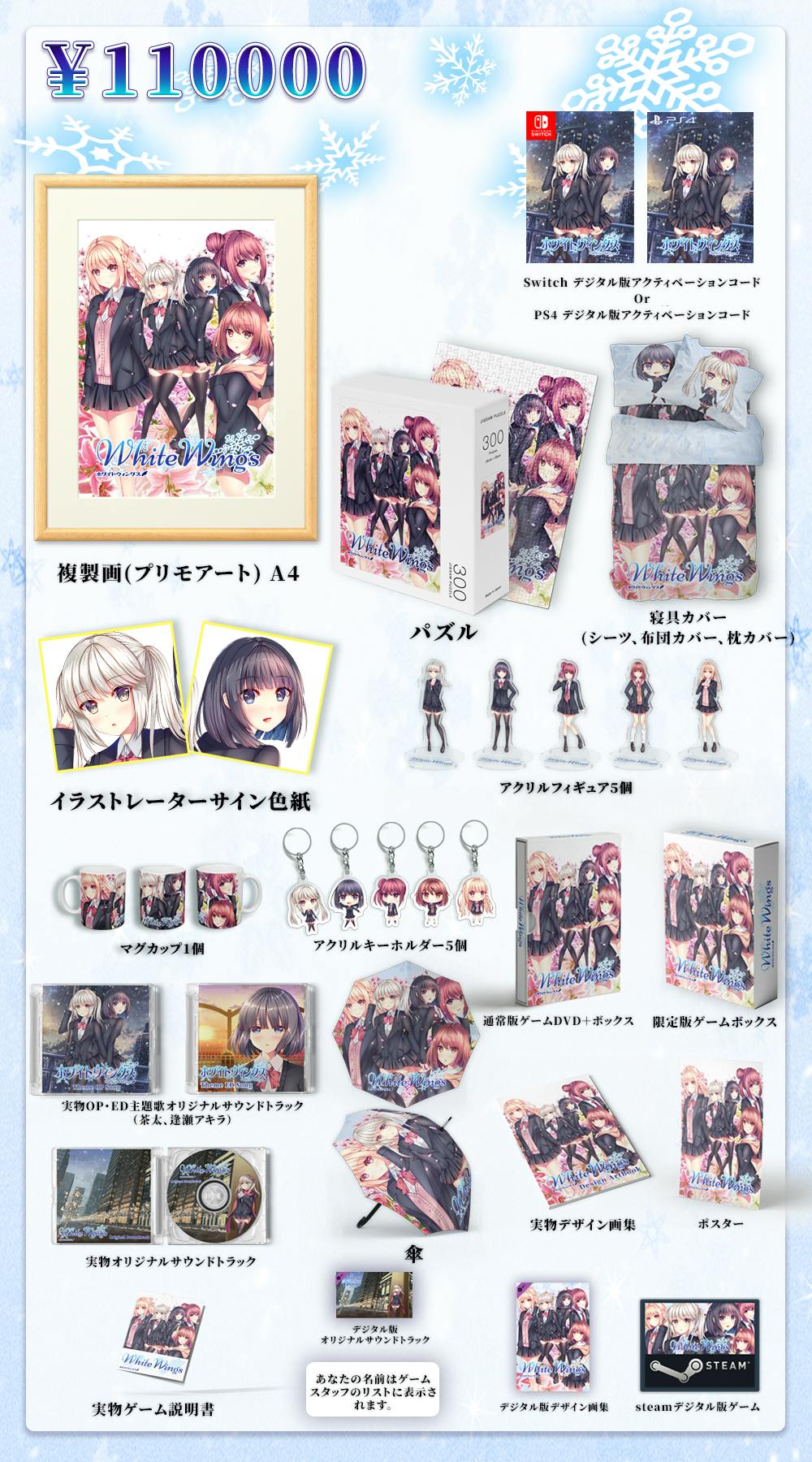 弊社pureworksは現在『ホワイトウィングス』の開発に努力しております!これは我々がまもなく世に送り出す新しいビジュアルノベルゲームです。我々はゲームのパフォーマンス上で、皆様に他にはないリアリティーを味わって頂きたいと願っております。このゲームの主題はねじれた三角関係の恋愛の中でのキャラクターの感情の変化、及び人間性のねじ曲がりと善悪を表現することにあります。