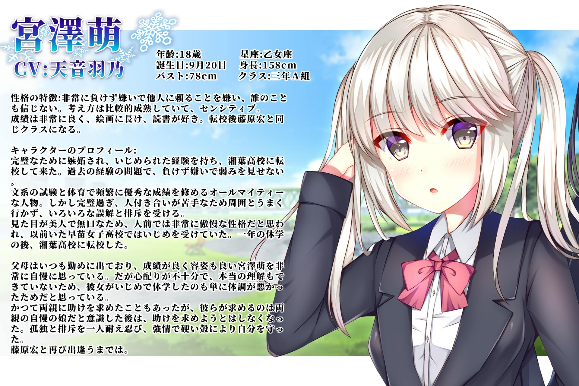 しかし、宮澤萌の綺麗な容貌と、成績優秀ながら冷やかな性格であることは、クラスメートの歓迎を受けず、彼女は人の近寄らない存在となった。だが、彼女の才能と美しさは家庭を早くに失った藤原宏の心を打った。しかも、彼女は藤原宏に対しては少し特別に振る舞うようだった。彼は宮澤萌に心を動かされずにはいられなかった。しかし、彼は宮澤萌に近付こうとしたとき、この女の子は本当に近寄りがたい存在なのだと分かった。