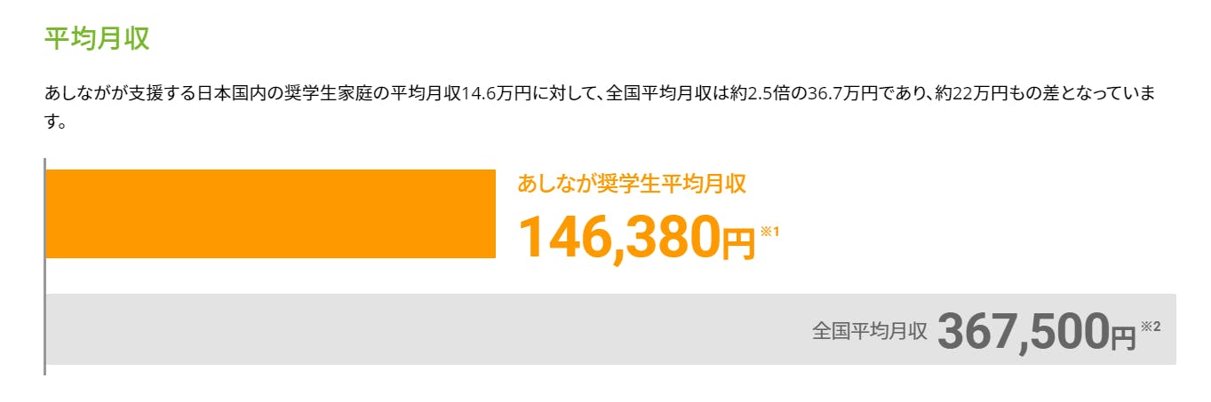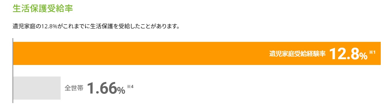 あしなが育英会の調査によると、遺児家庭の平均月収は14万6,380円(*1)となってます。また、生活保護受給率は12.8%(*2)と全国平均の1.6%を大きく超えており、奨学金なしでは大学・専門学校の学費を捻出できる水準には到底達していません。