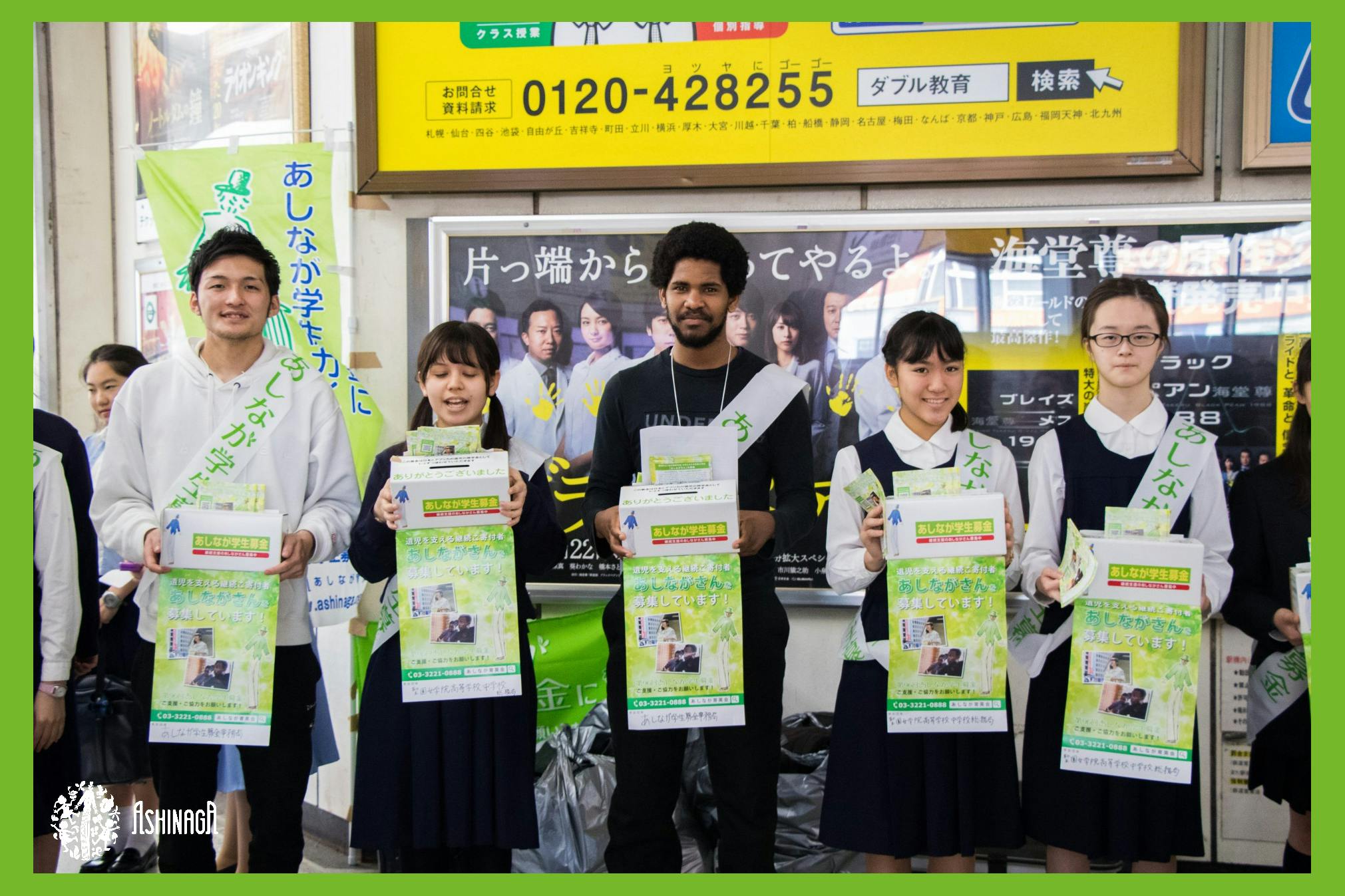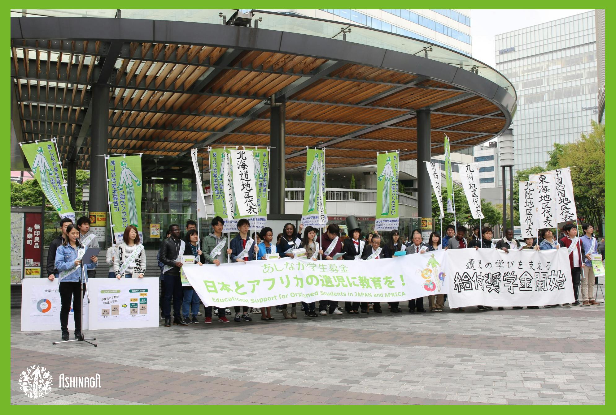 あしなが学生募金事務局は病気・災害・自死で親を亡くしたり、親に障がいがある学生の奨学金を支援する団体です。全国の専門学生と短大・大学生が運営し、毎年、春と秋の年2回街頭募金を行っています。街頭でいただいた寄付は全額あしなが育英会に寄付し、日本とアフリカの遺児学生のためのあしなが奨学金として利用していただいています。