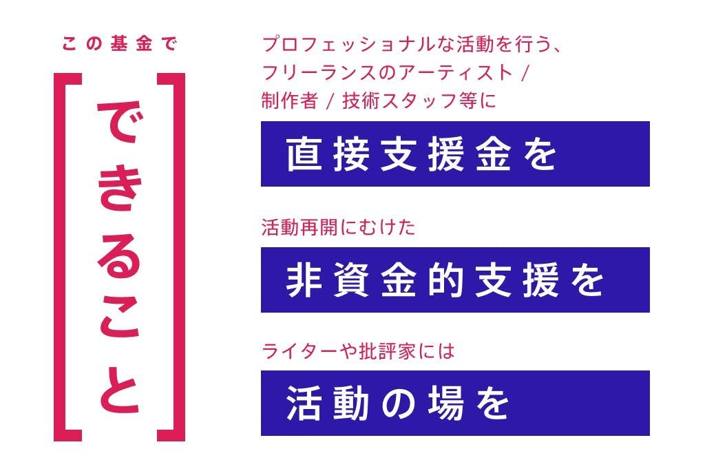 新型コロナウイルス感染拡大の影響を受けて活動が制限されているアーティスト、フリーランスの制作者や技術スタッフ。ダンサー、ミュージシャン、画家、照明スタッフ、劇作家、サウンドエンジニア等…営利・非営利や分野に関係なく、公演自粛等に伴う収入の減少に直面し、活動継続が困難になっています。
