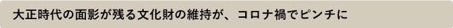 これまでも、東日本大震災をはじめとする天災で苦境に陥ってきましたが、今回の新型コロナウイルスの影響は先が見えず、頭を悩ませています。同じように各地で文化財を守り続けている仲間からは、建物の解体を考えざるを得ないほどの危機だ、との声も聞かれます。