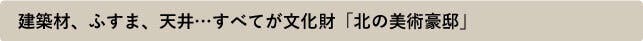 積雪の多い北海道では珍しい瓦葺屋根、軒下にはすべて手彫りの彫刻、床や柱は欅の春慶塗り、神代杉の幅広天井・屋久杉の天井、紫檀、黒檀、タガヤサン、白檀を使った書院づくりの床の間……と建築材も職人の技も、どれも一級のものばかり。
