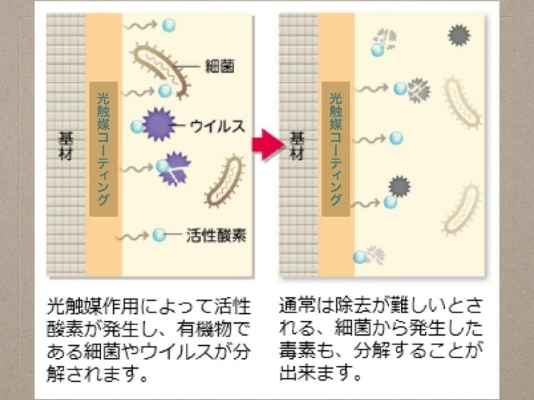 光触媒とは、酸化チタンなどの金属に紫外線が当たることで、周囲の有機物を水や二酸化炭素などの単純な構造の物質に分解する作用です。この作用を利用して、汚れやにおいの分解に役立てる技術を光触媒技術と呼んでいます。