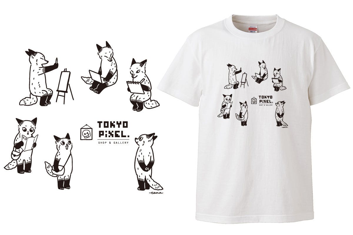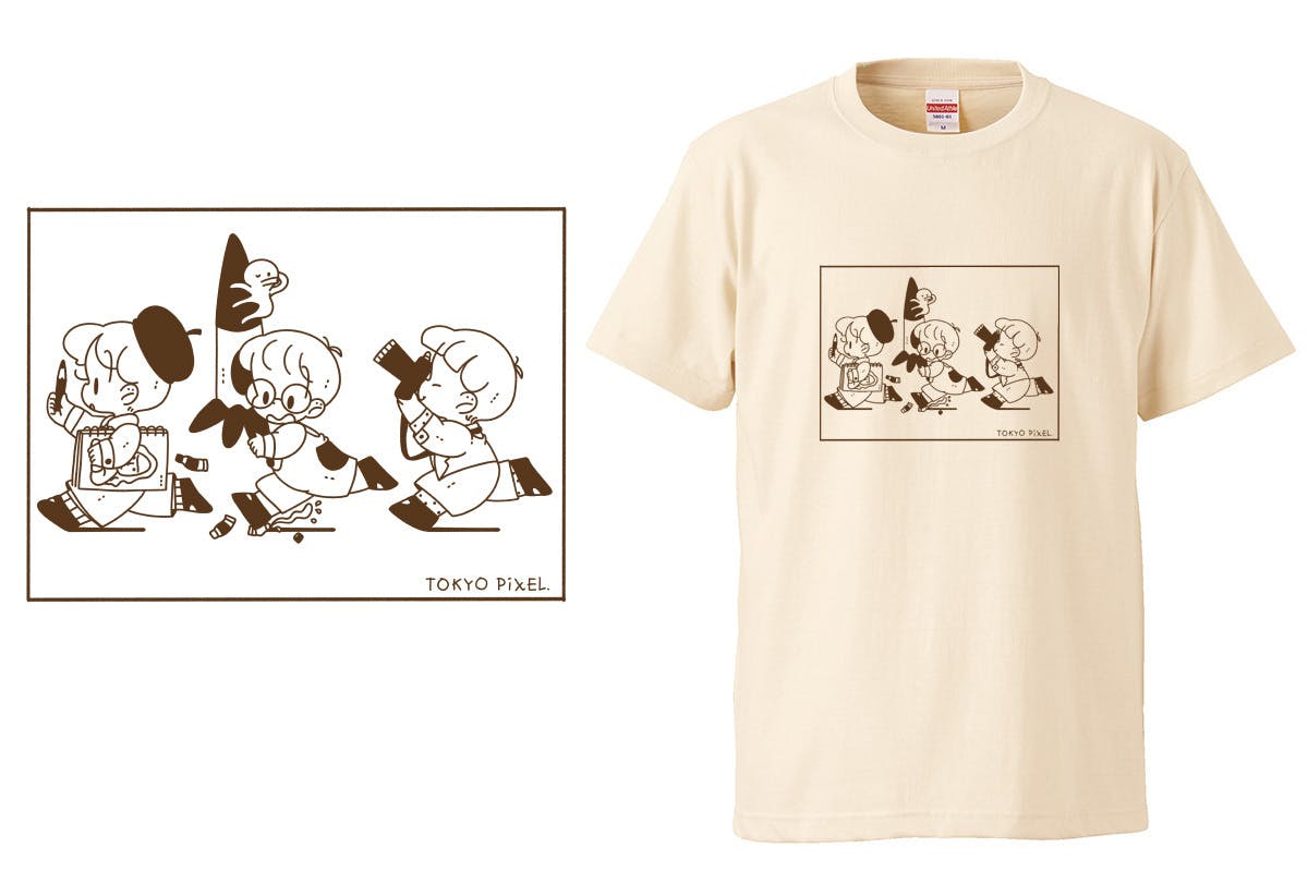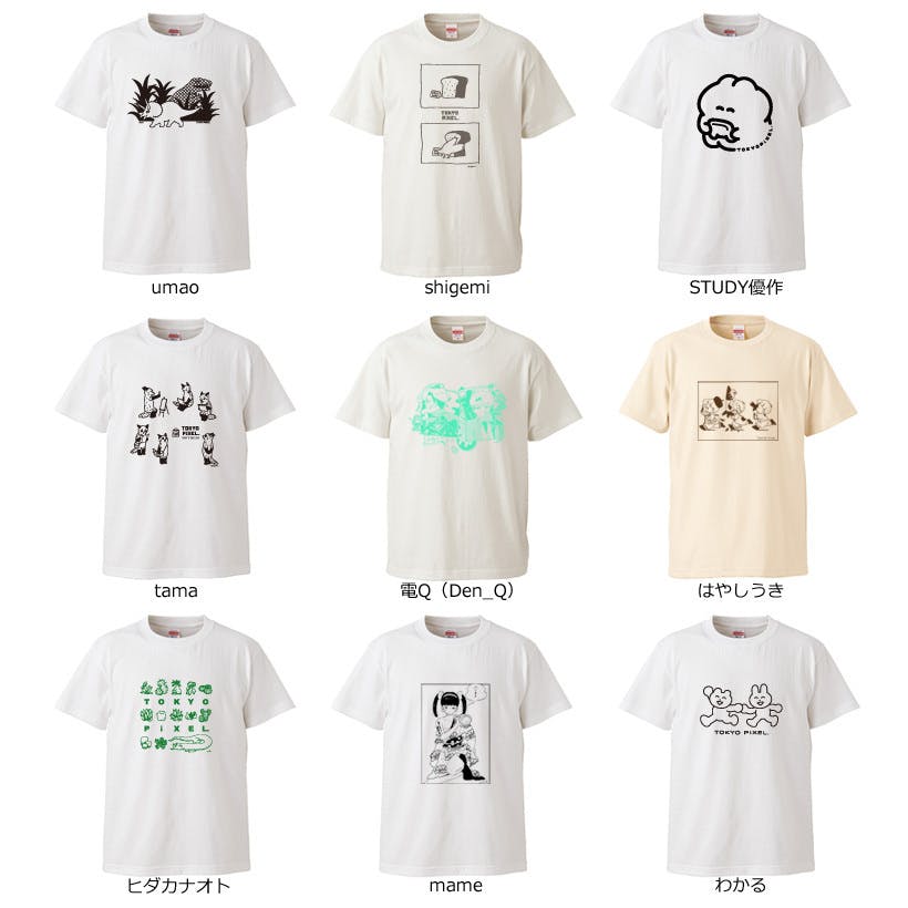 オリジナルグッズの他にこれまでにトーキョーピクセルギャラリーで個展を開いていただいた9名の作家さんにイラストをご提供いただきTシャツをリターン品として作りました。