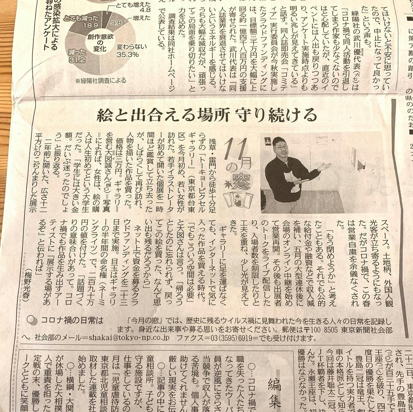2020/11/23 20:16こんばんはトーキョーピクセルギャラリーの大図まことです。本日最終日夜12時でご支援頂いておりますクラウドファンディングの募集が終了します。あっという間の2ヶ月間でした。少し早いですがご支援頂いた皆さん、リターン品のイラストを提供して頂いた作家さん、スタッフ、関わったすべての方に感謝を申し上げます。私達はとても小さな存在だと自覚しています。華やかな渋谷や原宿にあるわけでは無く、はたまたサブカル文化がある沿線でも銀座やデパートの上の方にある厳かな画廊でも無く東京の下町の路地にひっそり佇む小さなギャラリーです。本日の東京新聞朝刊で私達の活動を取り上げて頂きました。私達は創作活動の発表の場として、作品と出会える場としてオフライン、オンライン共にこれからも続けていきます。続けていくこと、それだけが強みです。ご支援頂き本当に有難うございました。これからもどうぞよろしくお願いします。 もっと見る