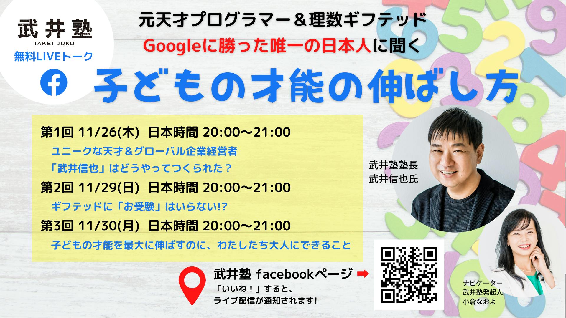 2020/11/25 18:37みなさん、こんにちは!武井塾発起人の小倉なおよです。明日11/26(木)日本時間20時より、全3回に渡って武井信也塾長をお招きし、「子どもの才能の伸ばし方」をテーマにお話を伺います!武井氏の豊かな才能に恵まれた子ども時代から、育ってきた環境、学歴に対する考え方など、そのユニークな人物像に迫ります。そして、武井塾をどんな私塾にしたいのか?その思いも聞いてみたいと思います。武井塾の公式Facebookページからご覧いただけます。(いいね! いただくと、通知されやすくなります)ぜひお楽しみに!元天才プログラマー&理数ギフテッドGoogleに勝った唯一の日本人に聞く子どもの才能の伸ばし方第1回 11/26(木)日本時間20:00〜21:00ユニークな天才&グローバル企業経営者、「武井信也」はどうやってつくられた?第2回 11/29(日)日本時間20:00〜21:00ギフテッドに「お受験」はいらない!?第3回 11/30(月)日本時間20:00〜21:00子どもの才能を最大に伸ばすのに、わたしたち大人にできること場所:武井塾公式Facebookページ もっと見る