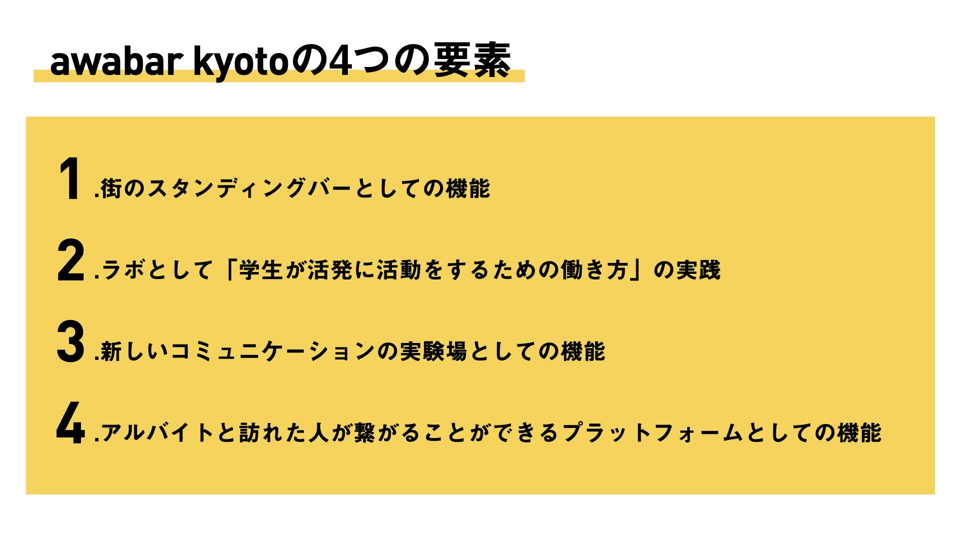 awabar kyotoは、経営者や起業家の方だけではなく、新しい価値や文化を生み出そうとしているクリエイティビティを育む学生が集まって、対話し、チャレンジを生み出していくような場所を目指しています!